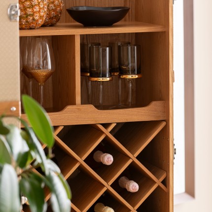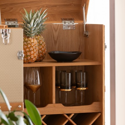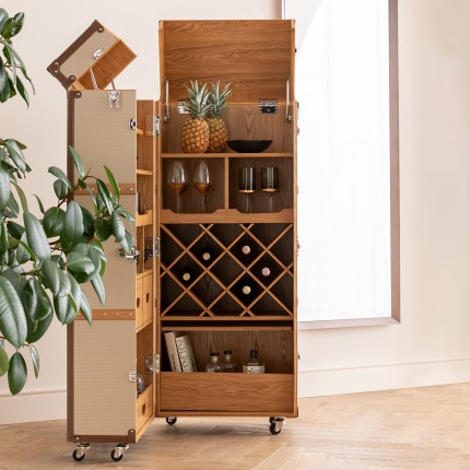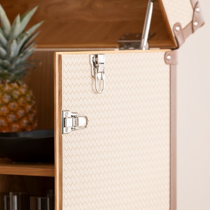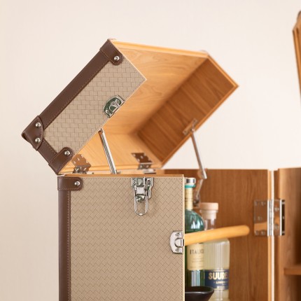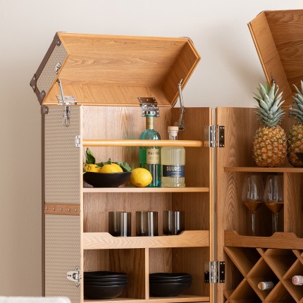 Cette malle qui contient un bar est une vraie pièce d’exception. Différents compartiments et porte-bouteilles ainsi qu'un plateau amovible se trouvent à l’intérieur pour des apéros réussis. Son revêtement en simili tressé beige est facile d'entretien.