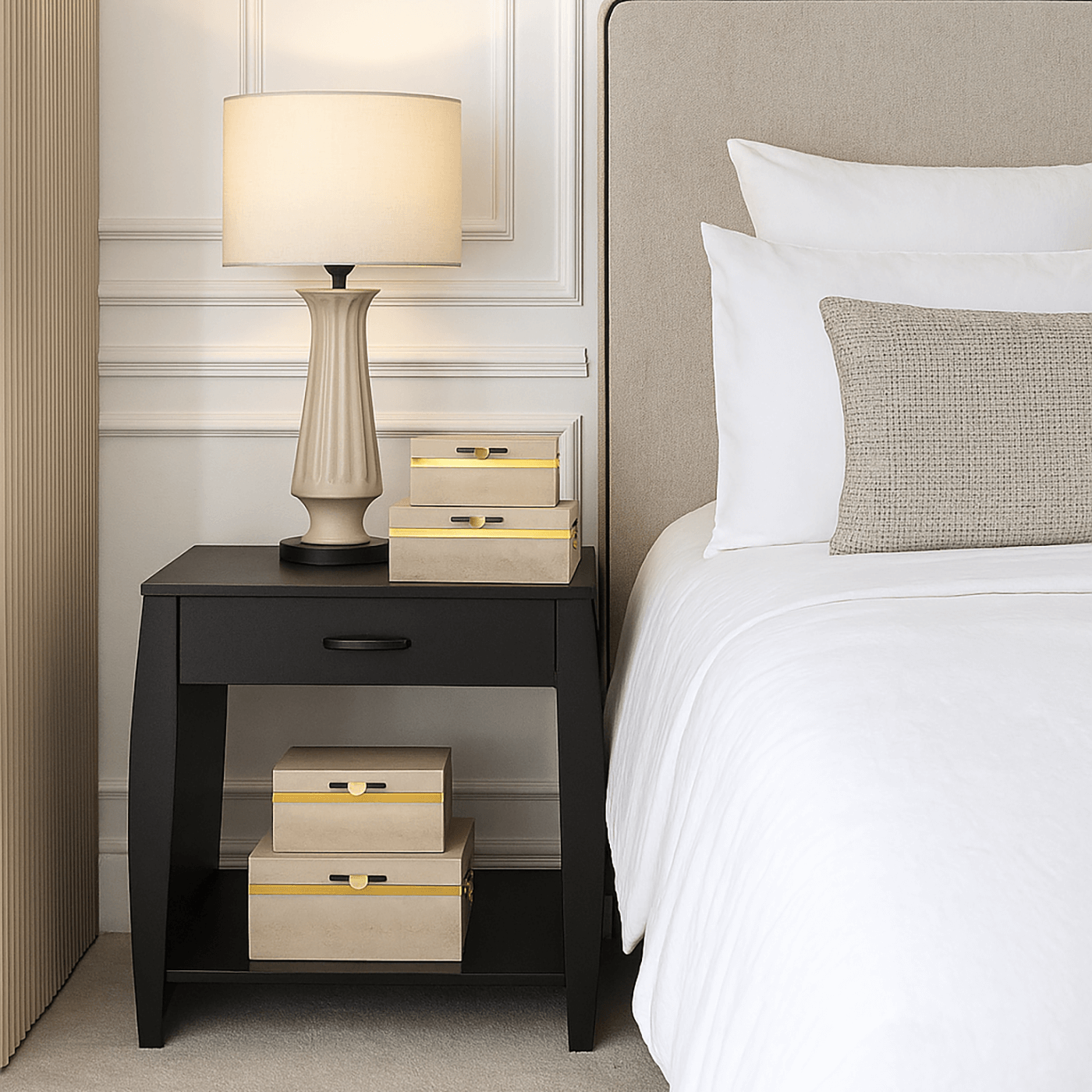 Avec leur revêtement texturé beige et leurs poignées noires et dorées, ces boîtes allient fonctionnalité et style pour un rangement chic et pratique. Avec leurs couvercles à charnières et les poignées des deux grandes boîtes, ces organiseurs sont extrêmement fonctionnels.