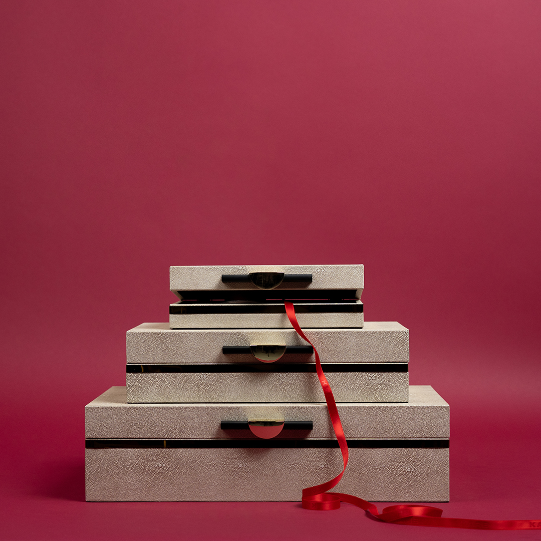 Avec leur revêtement texturé beige et leurs poignées noires et dorées, ces boîtes allient fonctionnalité et style pour un rangement chic et pratique.
