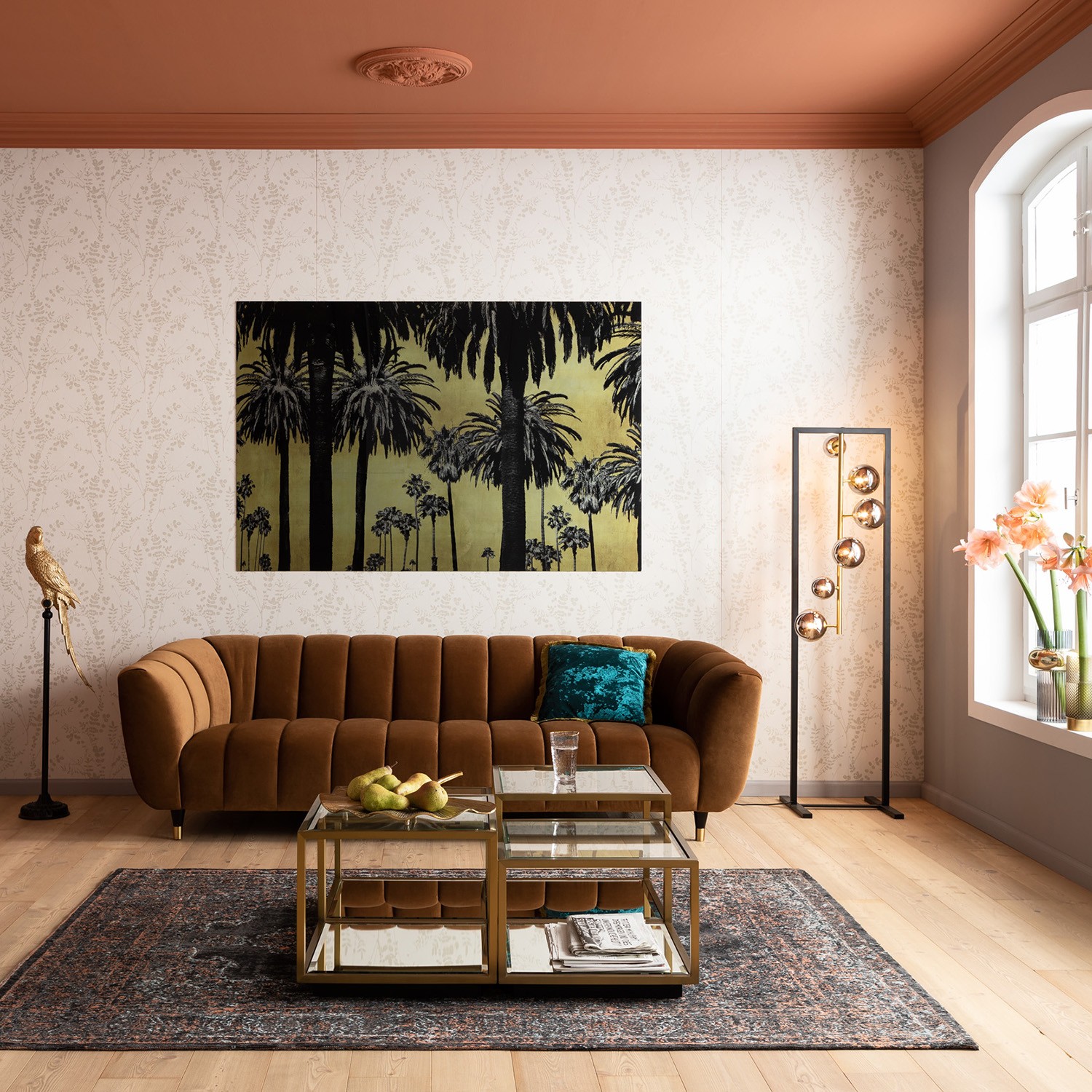 Avec son matelassage et son tissu velours, ce canapé s'inscrit dans une esthétique rétro. Il peut être associé au fauteuil de la même gamme.