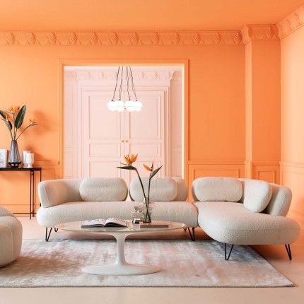 La gamme Peppo vous aide à créer une ambiance cosy et zen dans votre salon avec son tissu blanc aux noeuds en relief qui s'allie à des formes rondes et des pieds discrets en acier.