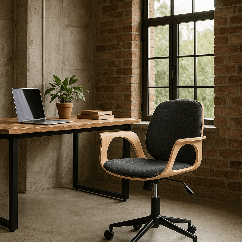Cette chaise de bureau va vous changer des modèles typiques et moroses aux angles stricts. Cette chaise vous permet d'affirmer votre autorité grâce au caractère du bois. Ses formes arrondies adaptées au corps humain et ses accoudoirs en bois vous offrent d'ailleurs un confort optimal. Grâce au duo de couleurs que cette chaise vous offre, vous pouvez la marier autant avec un bureau noir qu'avec un bureau en bois.