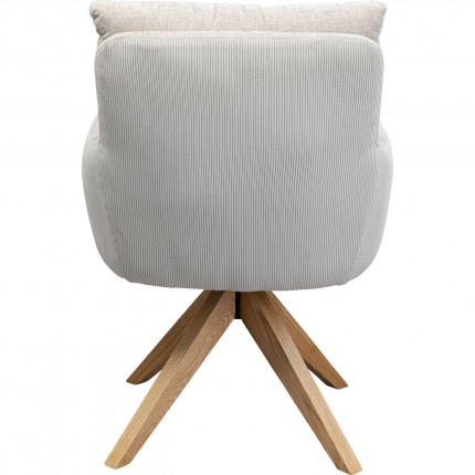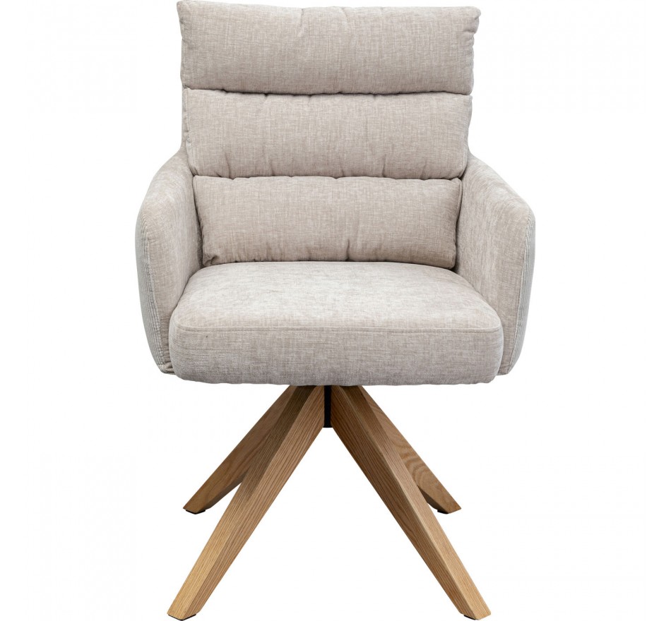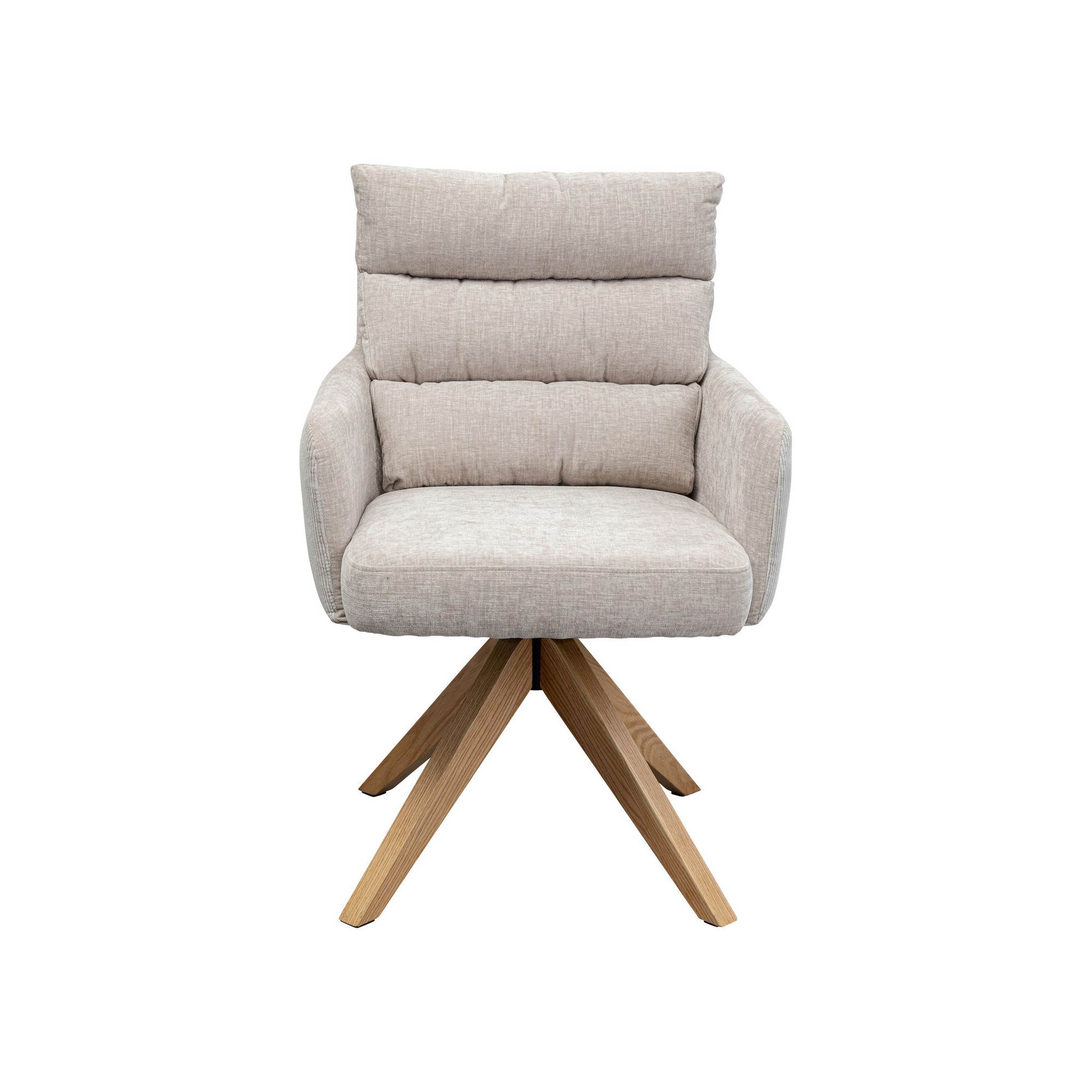Ce fauteuil de table pivotant trouve sa place dans votre intérieur scandinave grâce à son assise en tissu couleur crème et son piétement pyramidal en chêne.