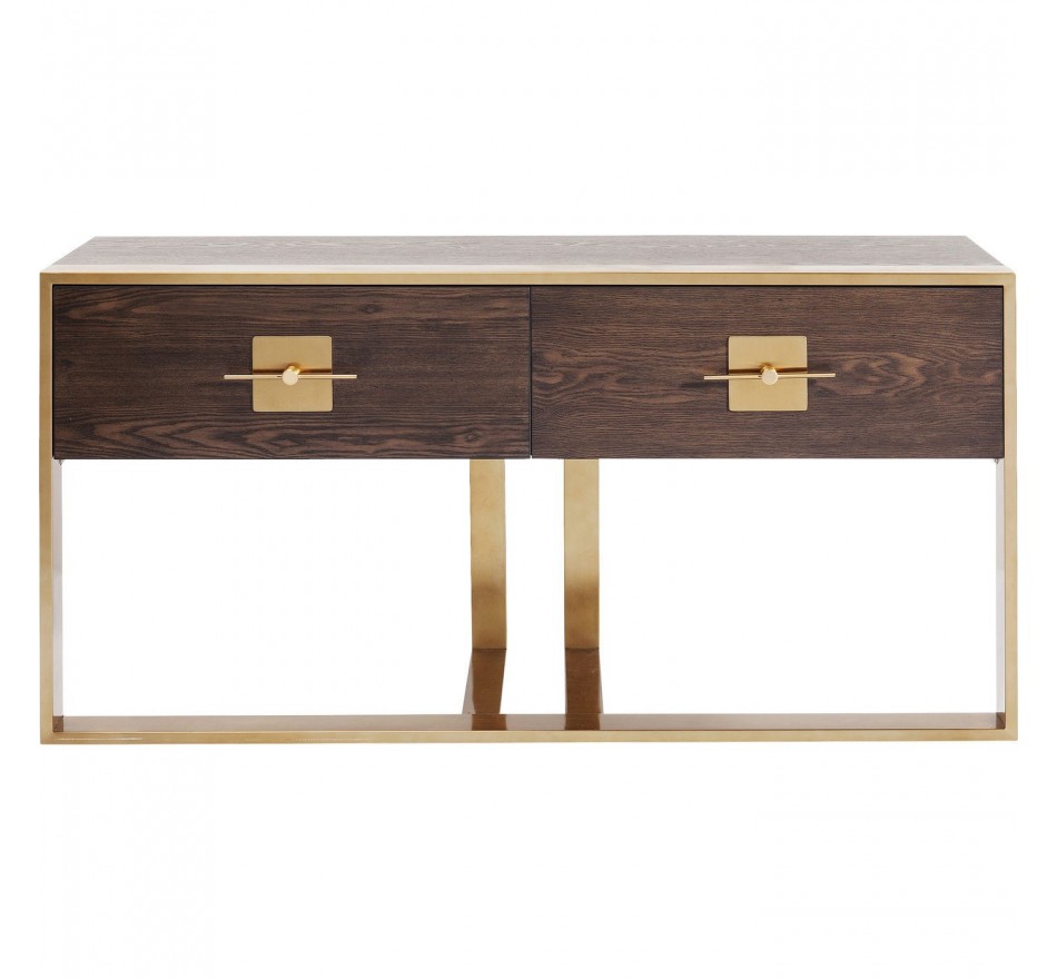 Cette console s'inscrit dans une esthétique rétro avec sa structure en frêne verni soulignée par des accents dorés. Sa façade est mise en avant par deux larges poignées et un cadre en métal qui inclut le piètement. La collection Osaka inclut également un buffet, un bureau, une table basse, une table à manger, un chevet et une étagère.