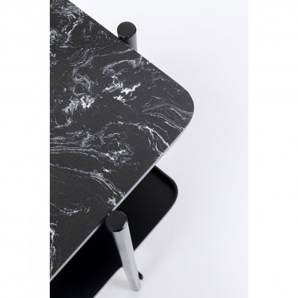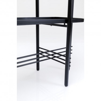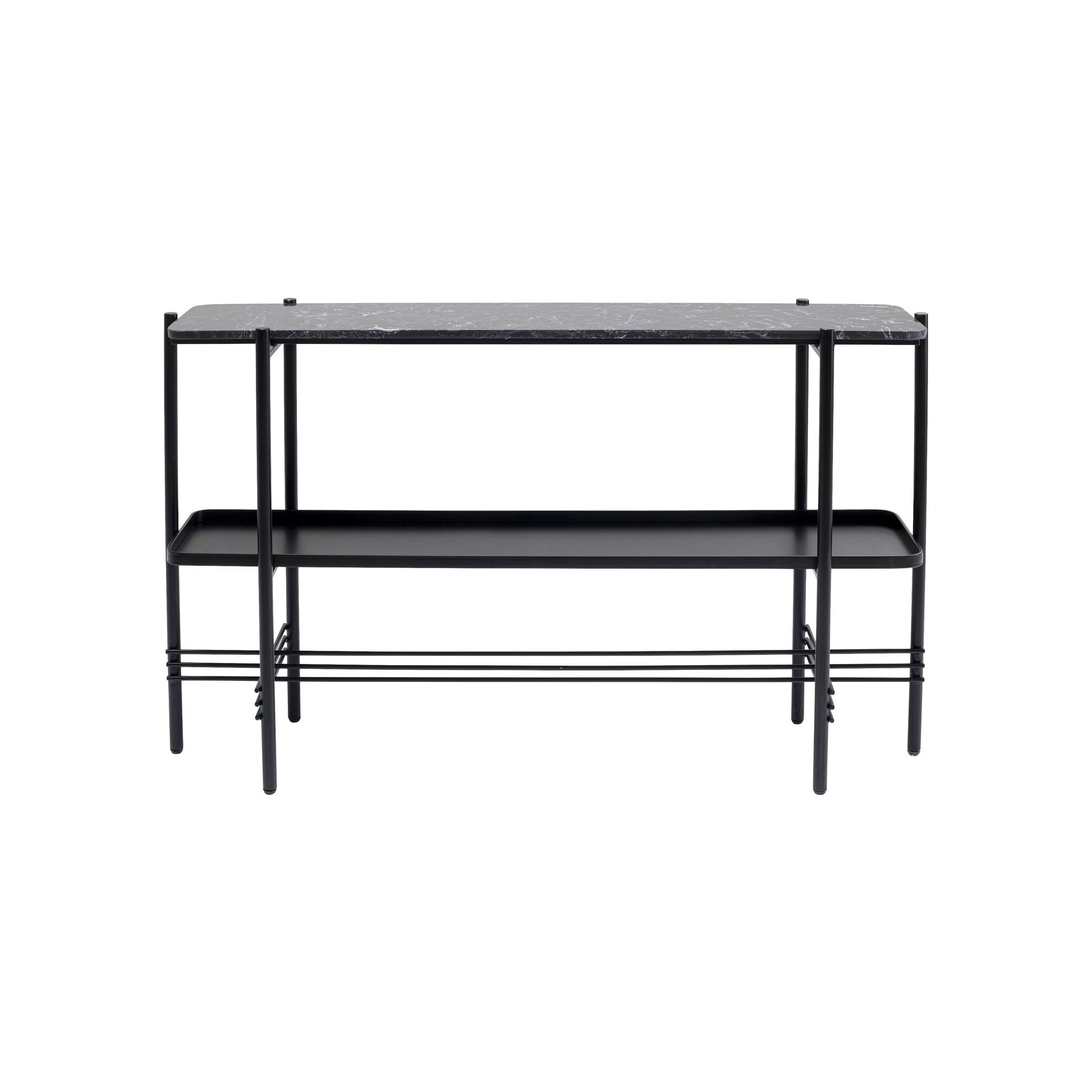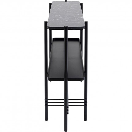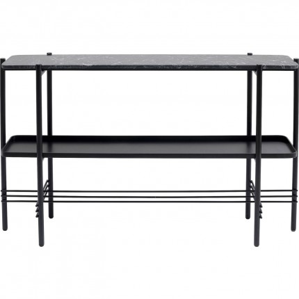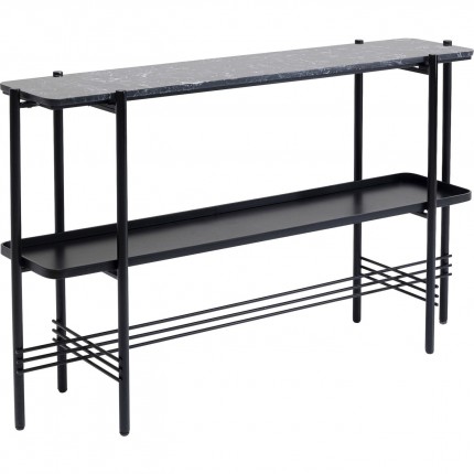 Cette console trouve sa place dans un intérieur moderne et épuré avec sa structure en acier noir. Elle allie des contrastes de géométrie avec ses fils droits entre les pieds opposés aux courbes arrondies des tablettes, le tout complété par la dualité entre le plateau inférieur en acier et celui supérieur en marbre minéral.