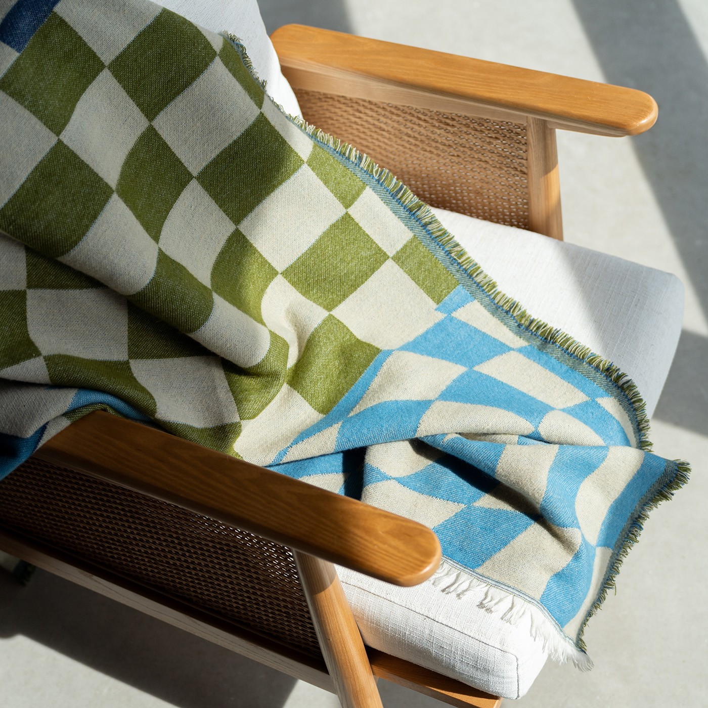 Ce plaid au motif de damier bleu et vert offre une touche de fraîcheur et de dynamisme à votre intérieur. Il apportera une note colorée à votre canapé ou lit.