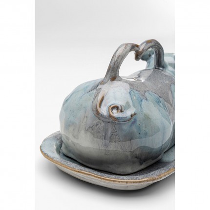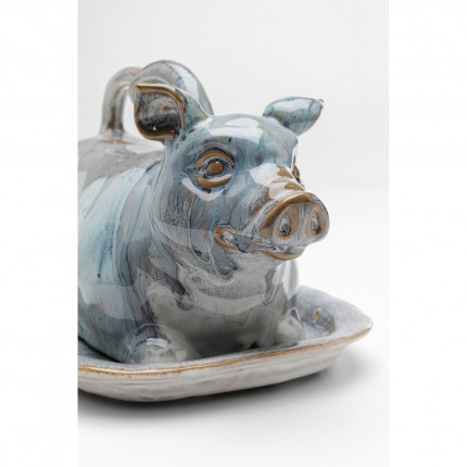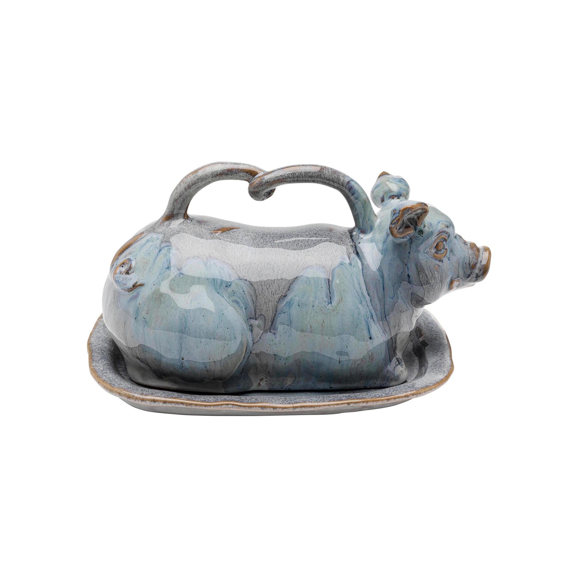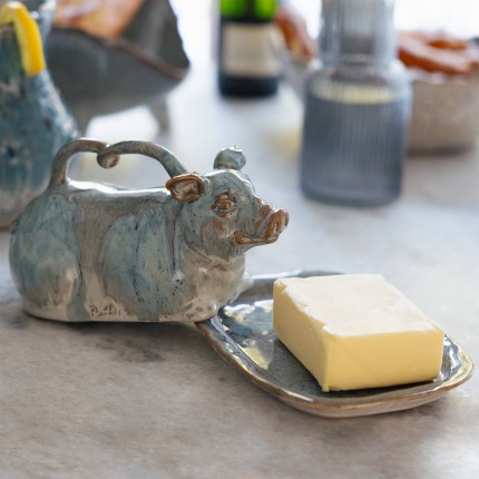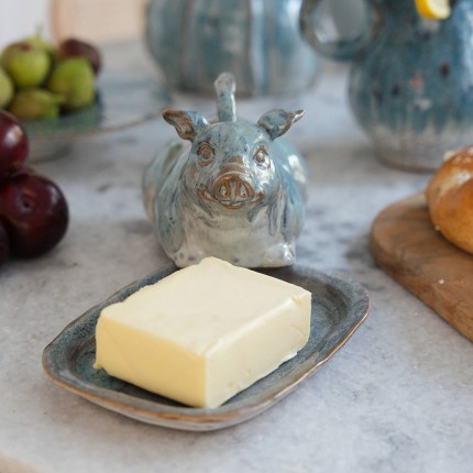 Ce beurrier en grès séduit par son bleu clair apaisant, rehaussé de petites touches colorées. Original et plein de charme, son design en forme de cochon gardera votre beurre bien à l’abri avec une touche de fantaisie.