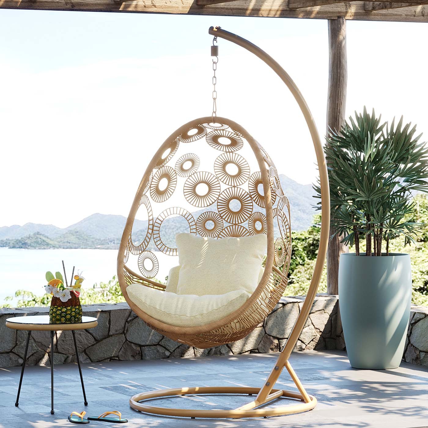 This hanging chair creates a cosy atmosphere and invites you to relax. Its round shape reminds the shape of an egg that will wrap you like a cocoon. In your living room or on a terrace, give yourself a moment of aerial rest.
