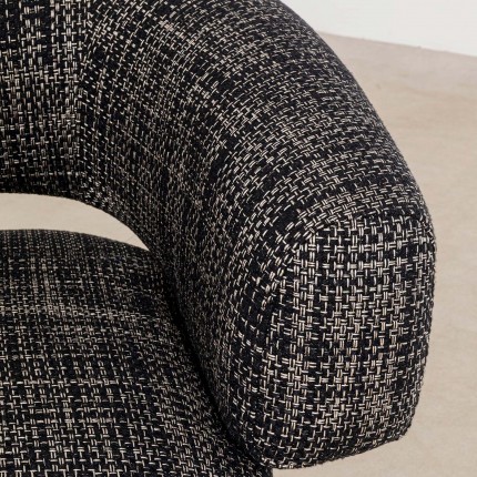 This armchair seduces with its black and white woven fabric combined with rounded shapes. The backrest extends over armrests and also swivels.