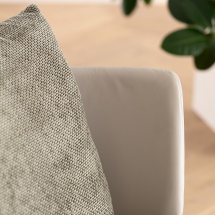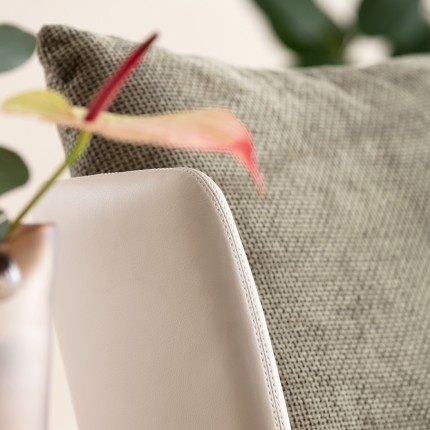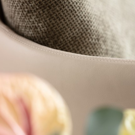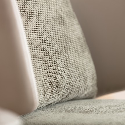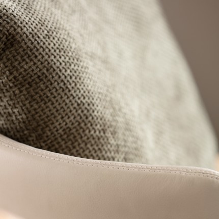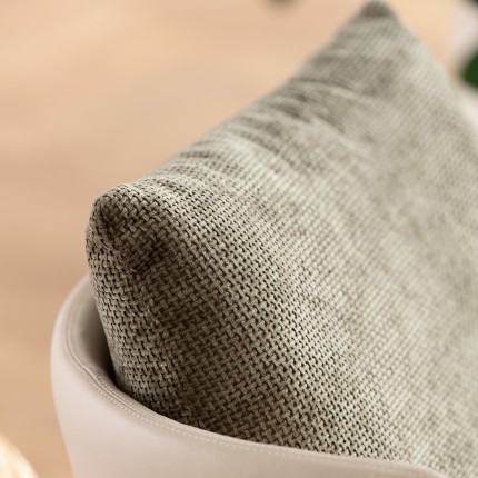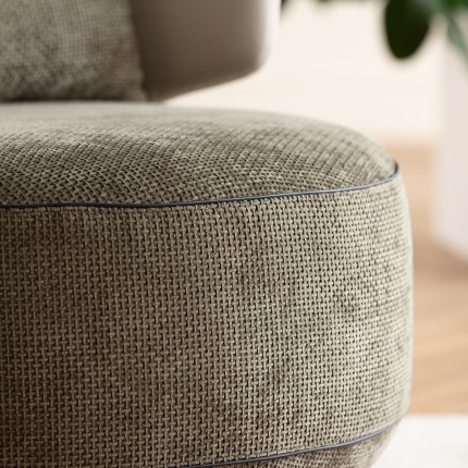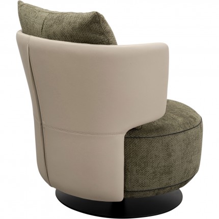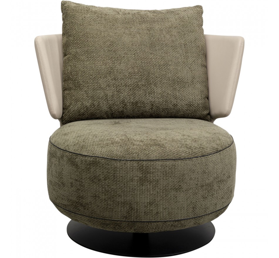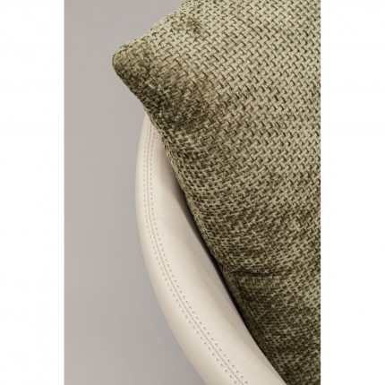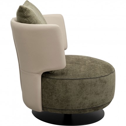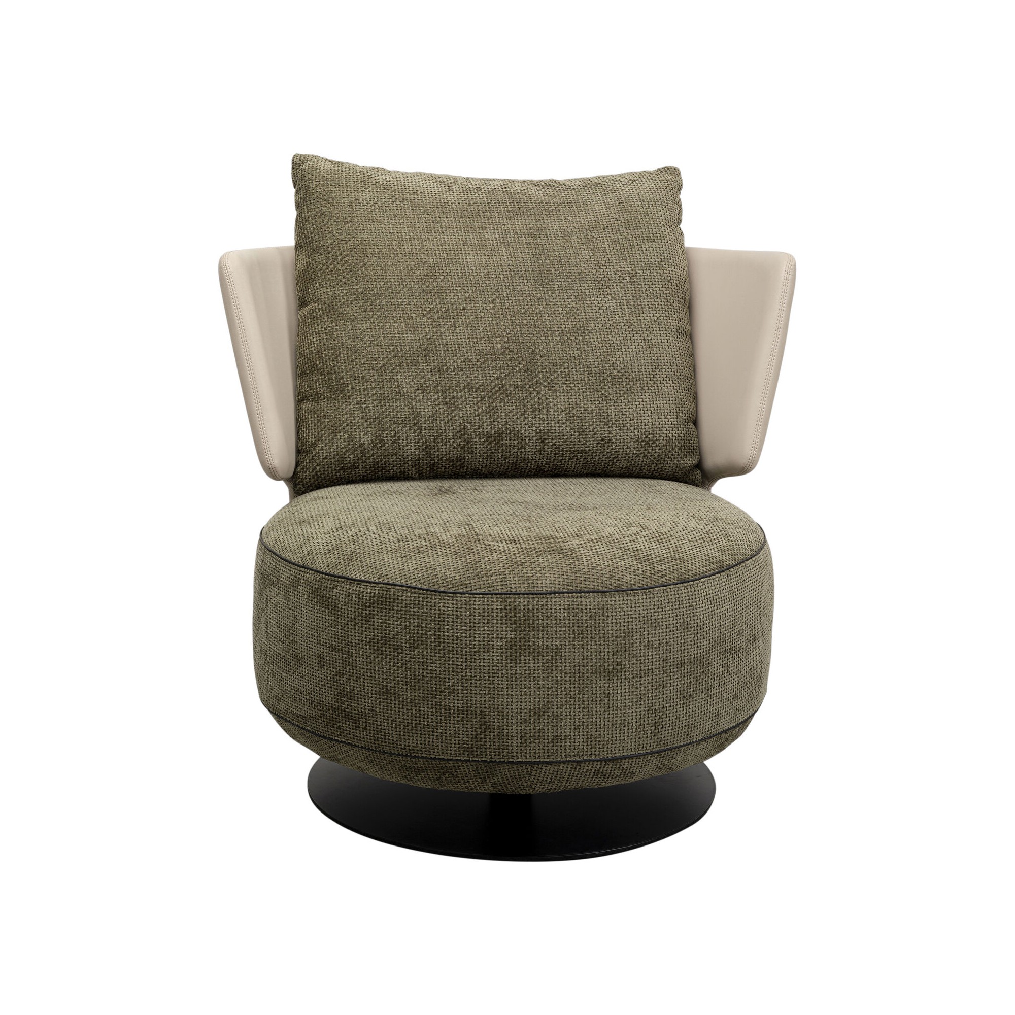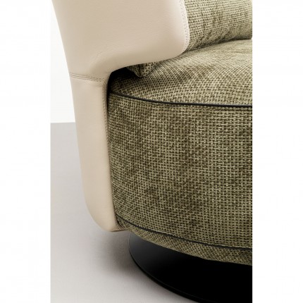 Bring a touch of modernity to your space with this captivating armchair design. Its woven green velvet seat is elegantly contrasted by the beige faux back. Its little extra? Its black circular foot that allows it to swivel 360°.