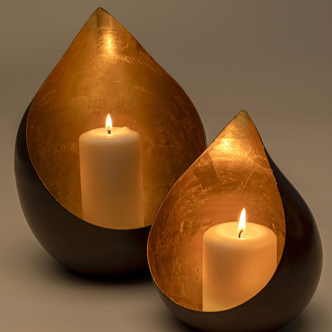 This drop-shaped candleholder captivates with its elegant contrast: an understated brown exterior and a luminous golden interior that delicately reflects the flame.