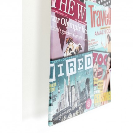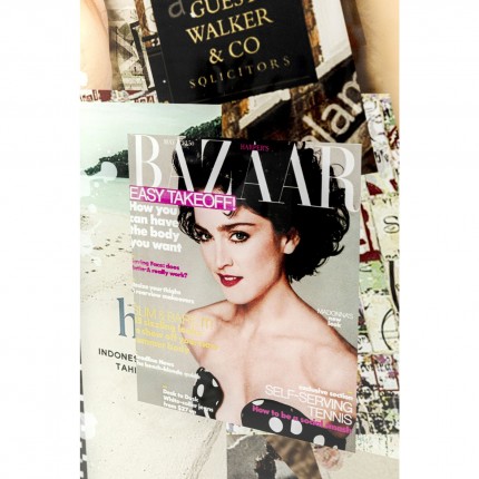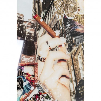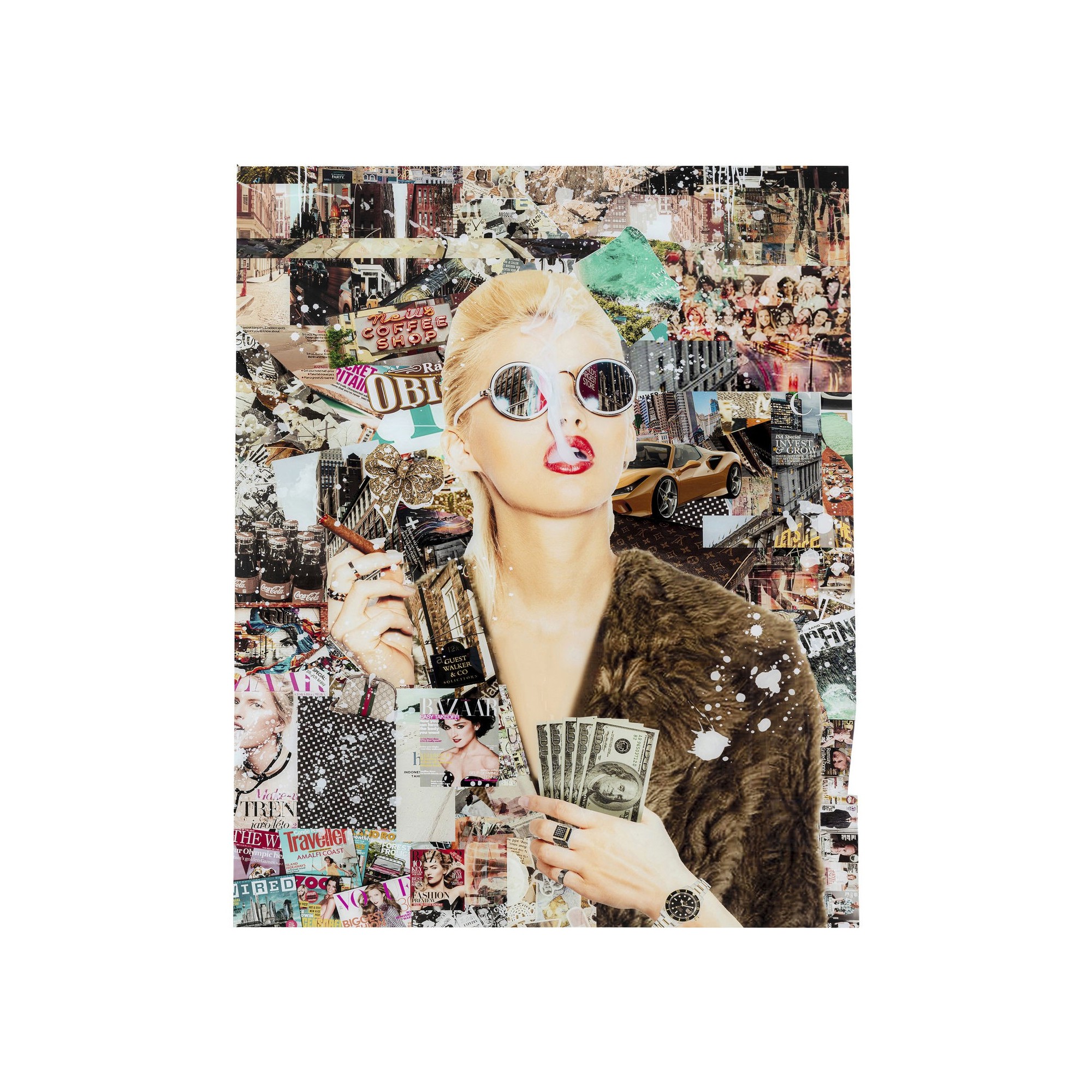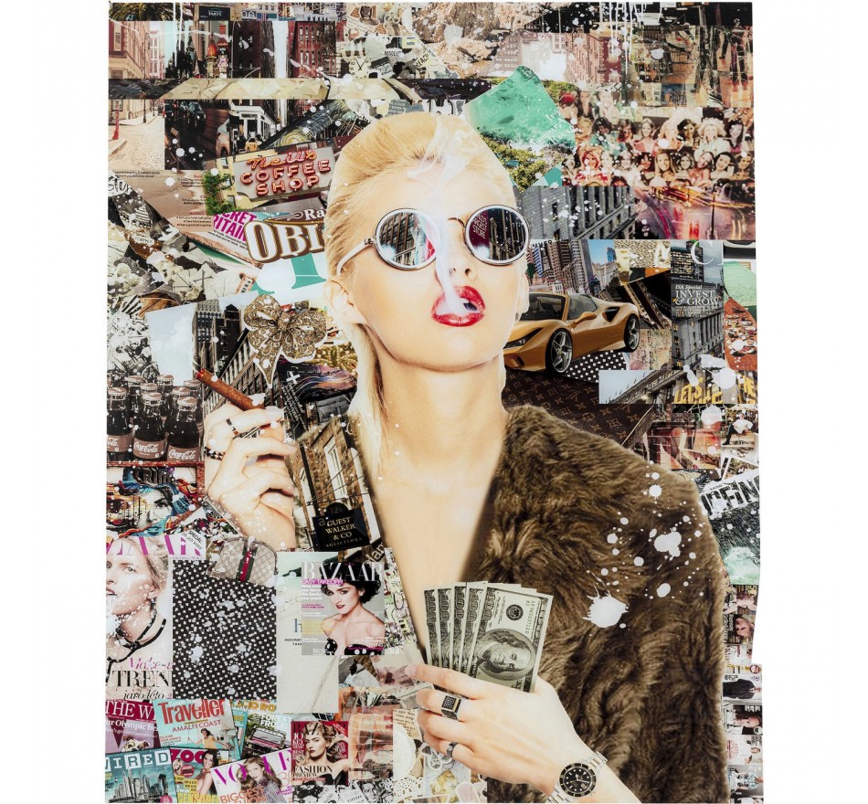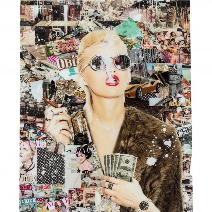 This collage of photos printed on glass invites you into a decadent urban world. The blonde woman in the center wearing a fur coat, money and a cigarette in her hand welcomes you into a world centered on fashion, party and luxury.