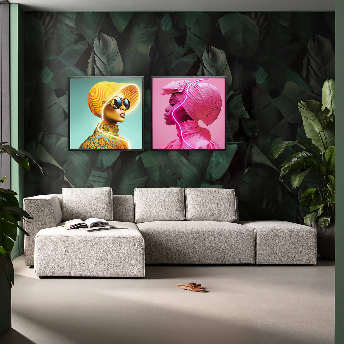 Bring a touch of refinement to your home with this painting. It depicts a woman dressed in yellow, standing out against a blue background. A yellow LED follows the woman's profile, adding a soft glow to this elegant work.