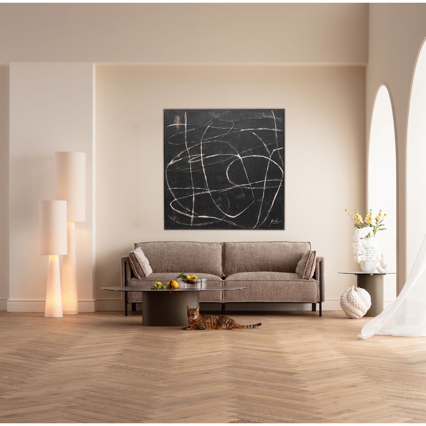 Let yourself be carried away by the contemporary elegance of this abstract work, where black and white intertwine in a dance that is both gentle and powerful. Each brushstroke invites reverie and brings a touch of serenity to your home. This painting is much more than a simple decoration: it's a true artistic expression, designed to sublimate your modern living spaces.