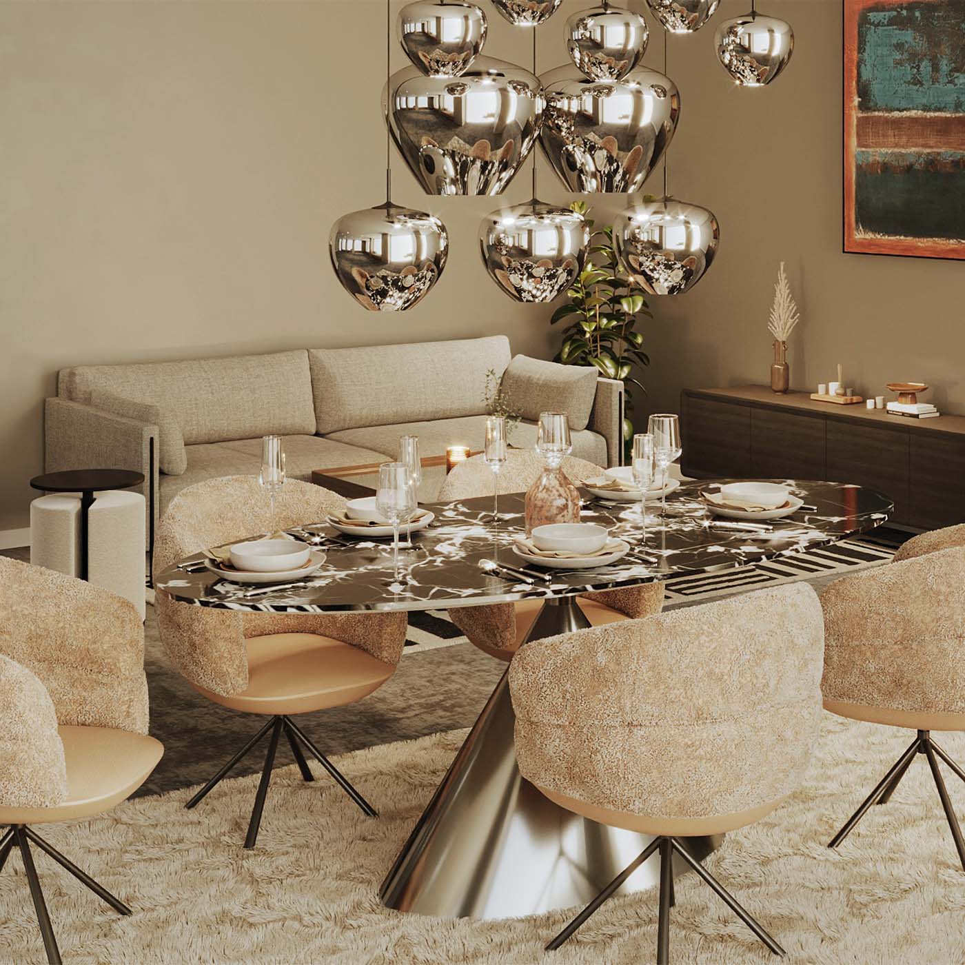 Elegant suspension light combining glass and steel, this luminaire becomes a real decorative asset in any interior. Comprising ten glass shades of different sizes, it reflects light captivatingly and creates a refined ambience. Its steel elements underline its luxurious character. With its generous dimensions, this large pendant can be easily adapted to a variety of spaces thanks to its adjustable height. Whether above a dining table, in a living room or as a decorative centerpiece, it blends harmoniously with all furnishing styles.