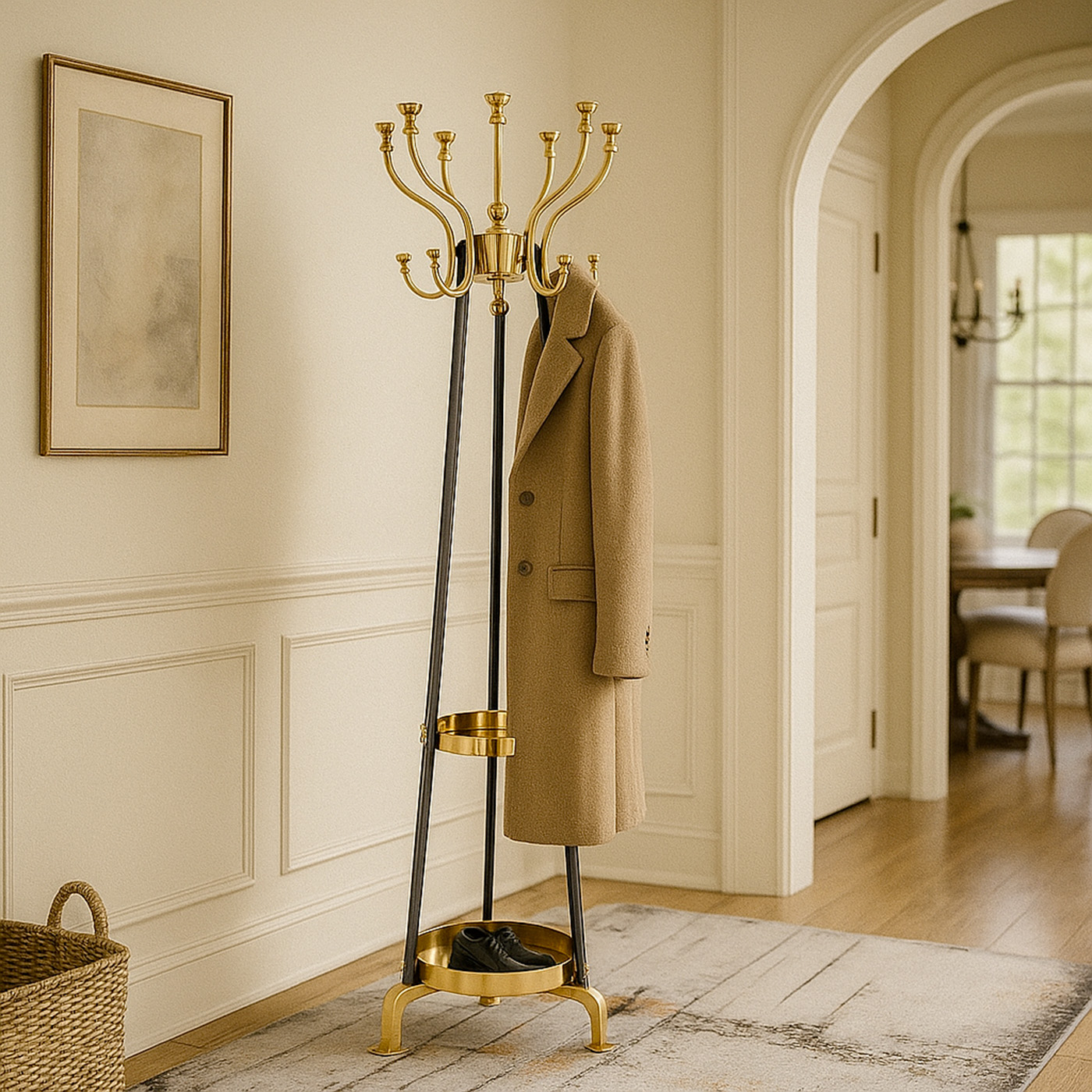 Take off your jacket and comfortably enjoy a coffee and cake in a café: this classic coat rack gives off exactly that kind of vibe, and we love it. Tall and narrow as it is, this coat rack is equally suited to small apartments or narrow corridors. The curved golden double hooks in dreamy vintage style and the umbrella stand are in powder-coated aluminum and offer a glamorous contrast to the black powder-coated steel structure. All in all, a practical and aesthetic entrance checkroom that catches the eye!