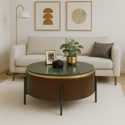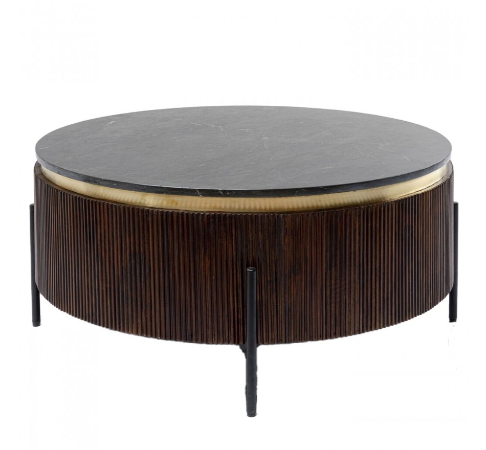 The Catalina collection transports you into a retro world with the combination of solid dark mango wood in relief, a golden border and a black mineral marble top, all mounted on a black steel base.