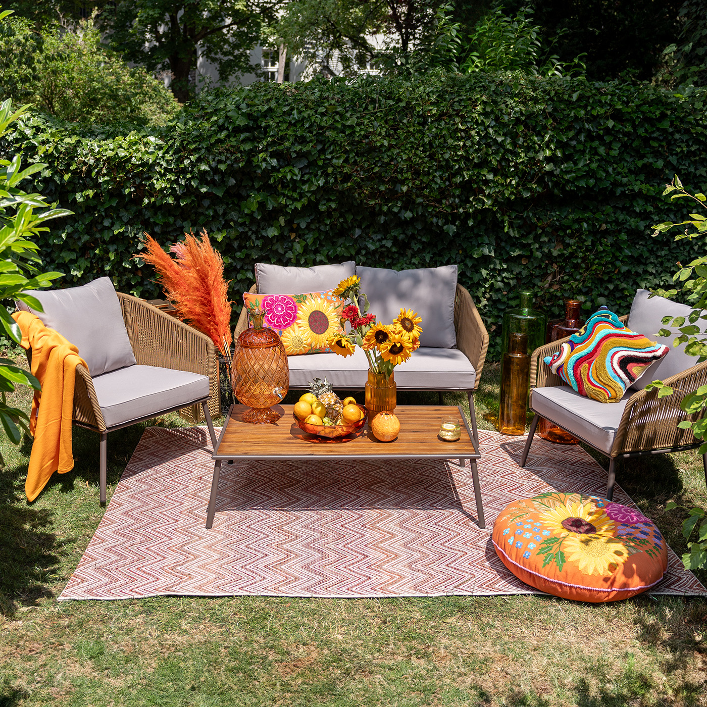 This rope-seated garden lounge consists of 2 armchairs and a 2-seater sofa to accommodate 4 people for a relaxing moment. The coffee table elegantly completes the ensemble.