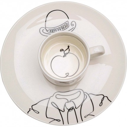 This set of 4 cups and 4 bowls depicts a man in a suit and hat, with black lines on a white background. The apple in the cup acts as the character's face to complete the portrait.