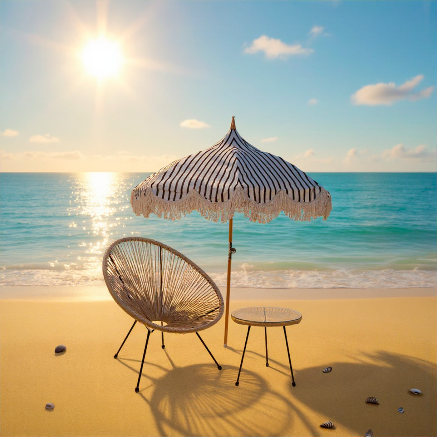 This large round parasol in black and white creates a strong impression in outdoor spaces thanks to its striking stripe pattern, pointed shape and decorative fringed edge. The solid beechwood pole ensures stability and adds a natural touch to the design. A large shade area transforms your terrace, balcony or garden into a veritable haven of relaxation on sunny days. Thanks to the side tilt function, the parasol can be flexibly adjusted and easily adapts to the position of the sun, stylish protection with maximum mobility.