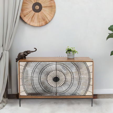 Let yourself be mesmerized by this ethnic piece of furniture that can be used as a sideboard for your dishes or a chest of drawers for your clothes. Its solid wood front features hand-carved lines traced in black paint. The concentric circles and rays around the handle are inspired by the pupil in the center of the eye. Inside, the shelf is removable but cannot be adjusted in height.
