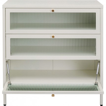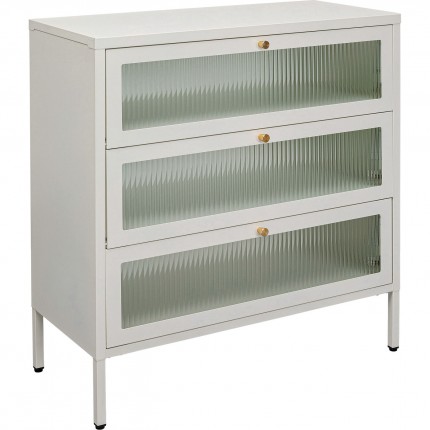 This white steel chest of drawers features drawers partially lined with textured glass, adding a subtle note of refinement and lightness. The combination of steel and glass creates a modern, sophisticated contrast, enhanced by gold handles.