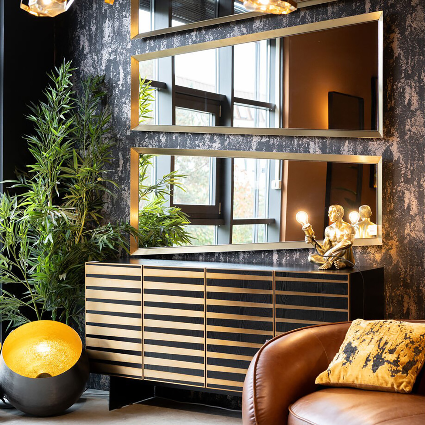 This sideboard's graphic design seduces with its play of horizontal gold lines on a black background, creating an elegant, modern contrast. Whether in the living room, hallway or dining room, it offers generous storage space while adding a touch of style.