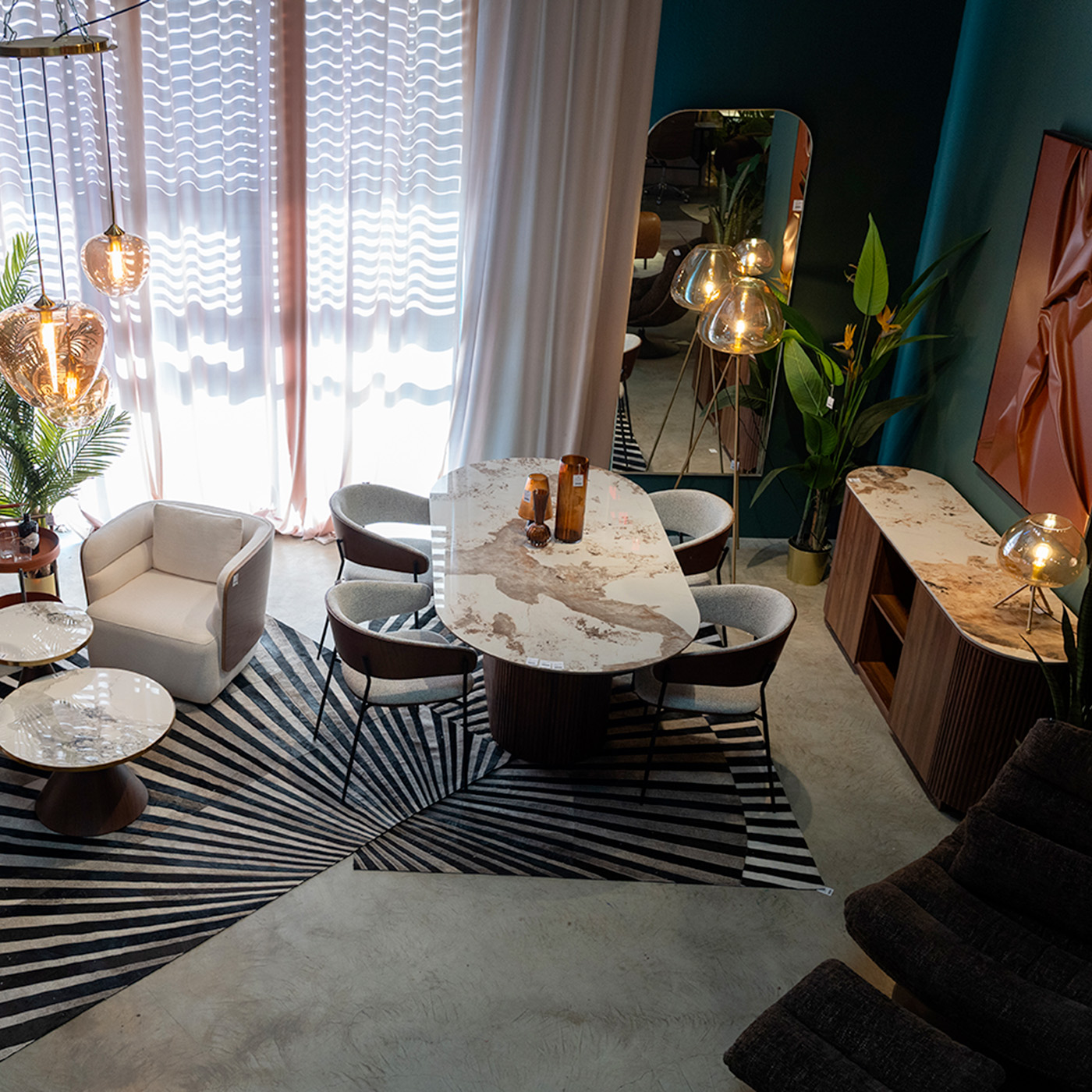 This sideboard stands out for its elegant, structured design, making it a striking and refined centerpiece for the living room. Its combination of rounded lines and generous proportions adds a warm, contemporary touch to your home. The contrast between the brown frame and the stoneware top gives the piece a sophisticated look.