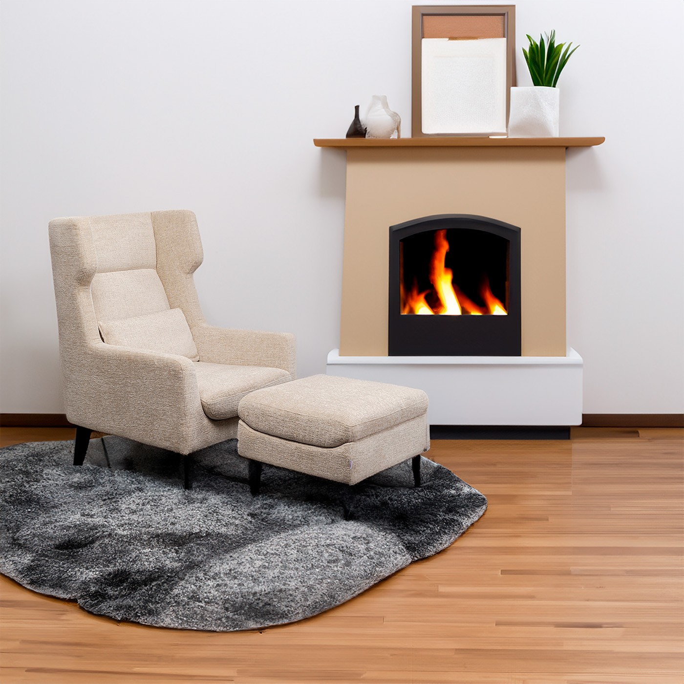 Détendez-vous dans ce fauteuil avec son repose-pieds assorti, le tout en tissu beige tressé épuré avec des pieds fins en acier noir élégants. Le fauteuil à oreilles doté d'accoudoirs vous enveloppe dans son étreinte tandis que le repose-pieds vous permet d'étirer vos jambes pour encore mieux vous relaxer.