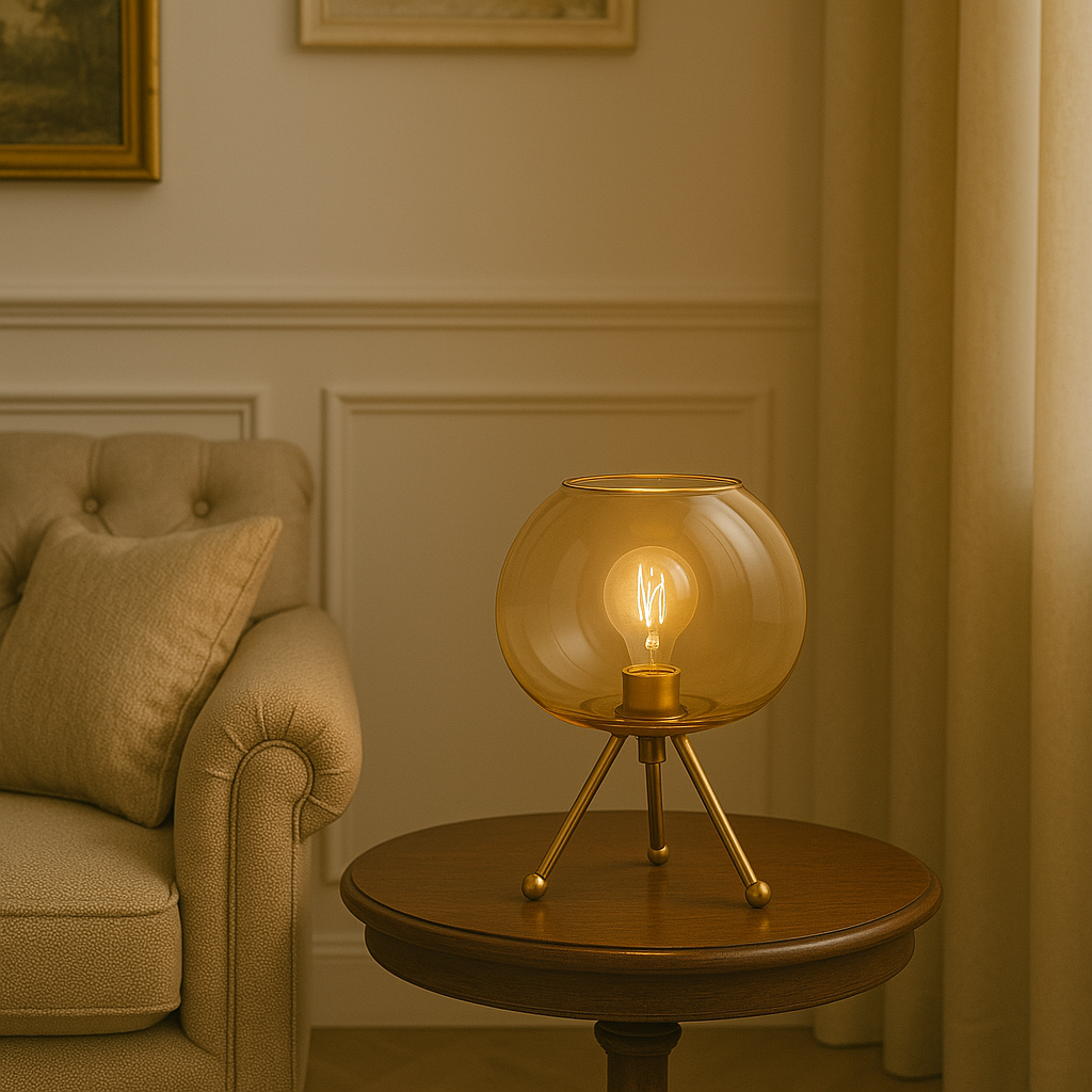 Illuminez votre espace avec cette lampe de table qui se distingue par ses trois pieds et son abat-jour en verre teinté qui diffuse une lumière douce.