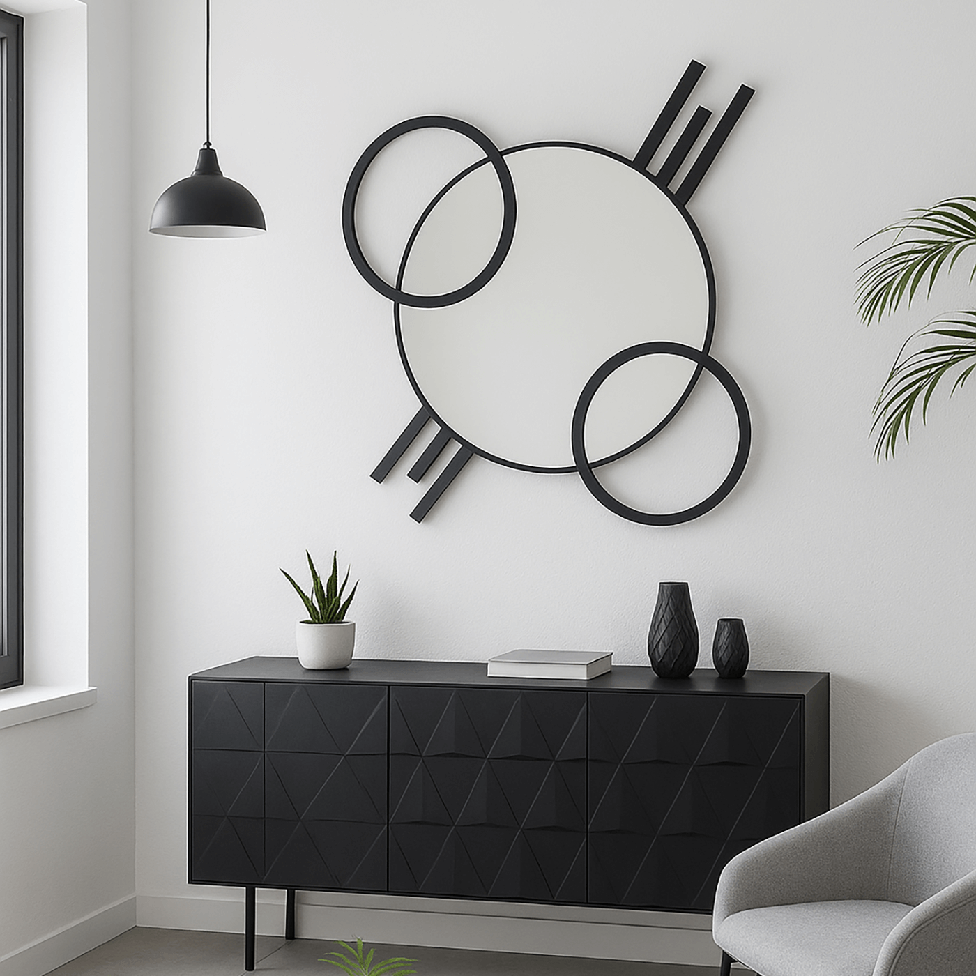 Le grand miroir rond central est encadré de trois lignes, avec la barre centrale légèrement plus courte pour un design asymétrique audacieux. Deux cercles sont ajoutés à l'avant du miroir, ajoutant une dimension sculpturale et contemporaine.