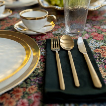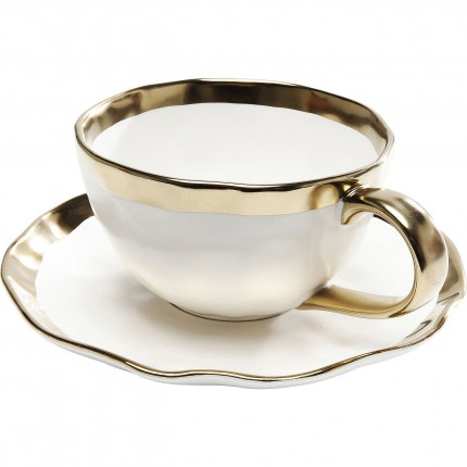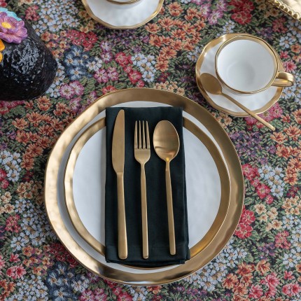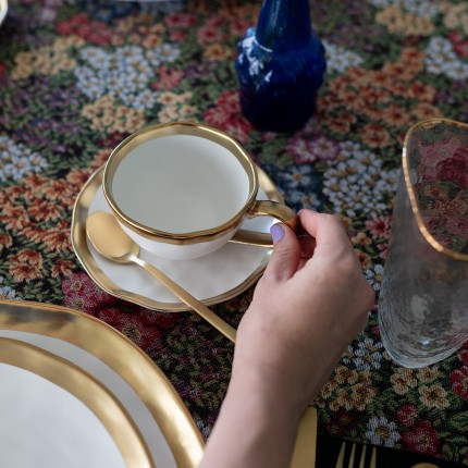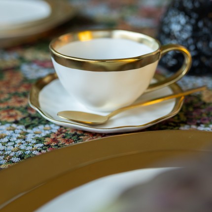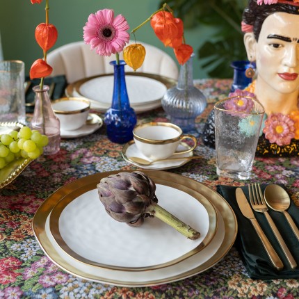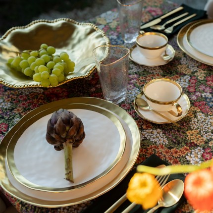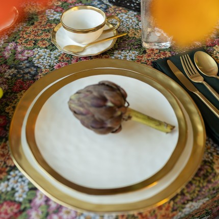 La gamme Bell vous propose une série de bols, tasses, plats et assiettes. En porcelaine blanche avec le bord doré, elle apporte de l'élégance à vos repas.