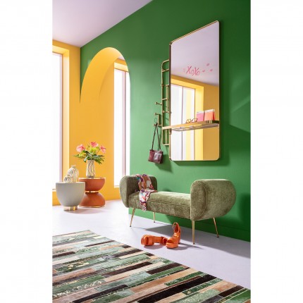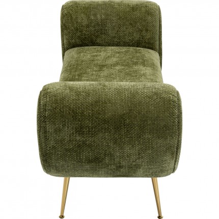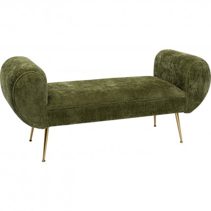 Deze bank zal er geweldig uitzien in uw huis met zijn brede armleuningen in combinatie met een groen fluwelen geweven stof en stalen poten.