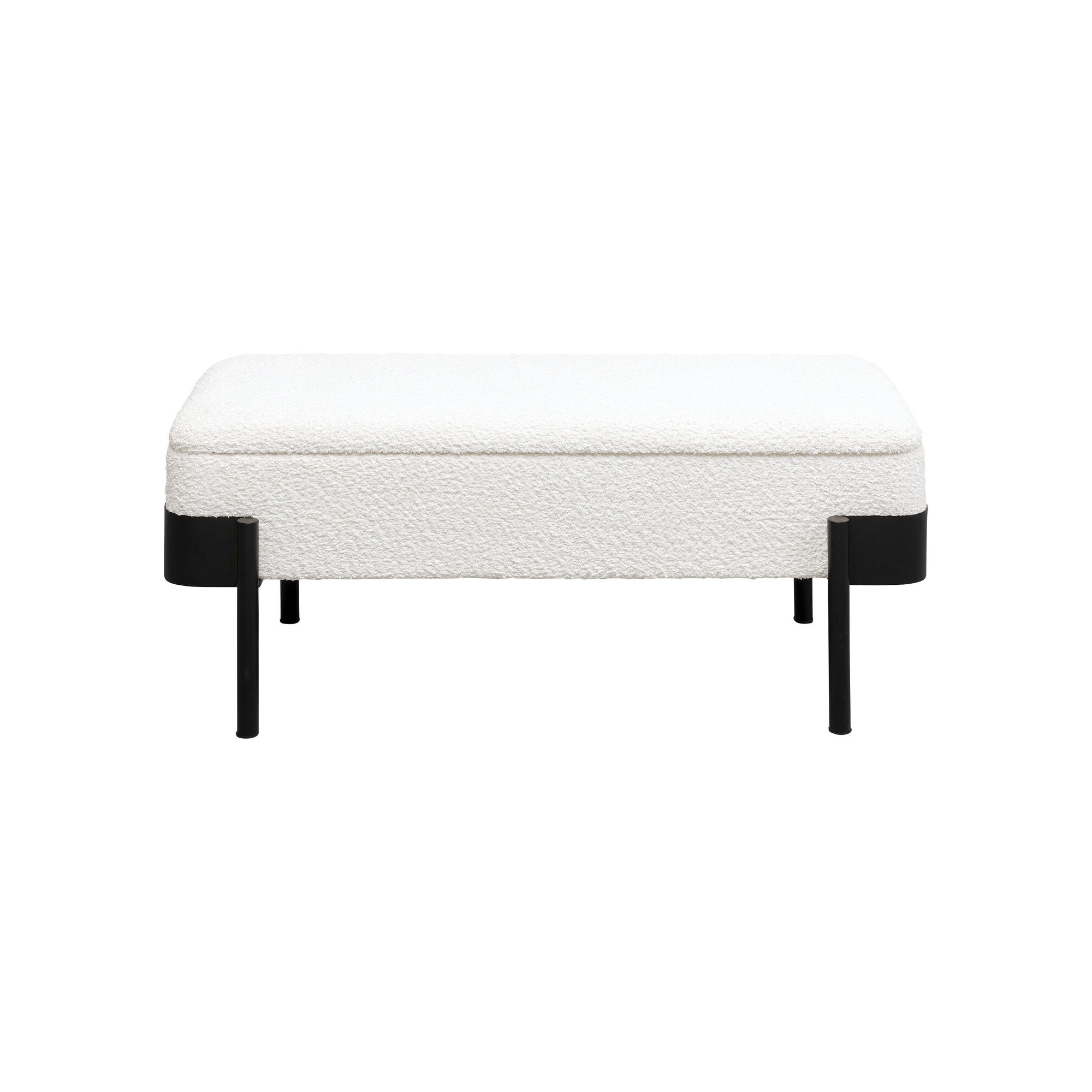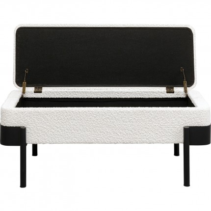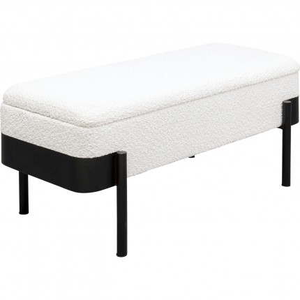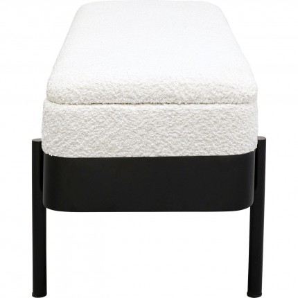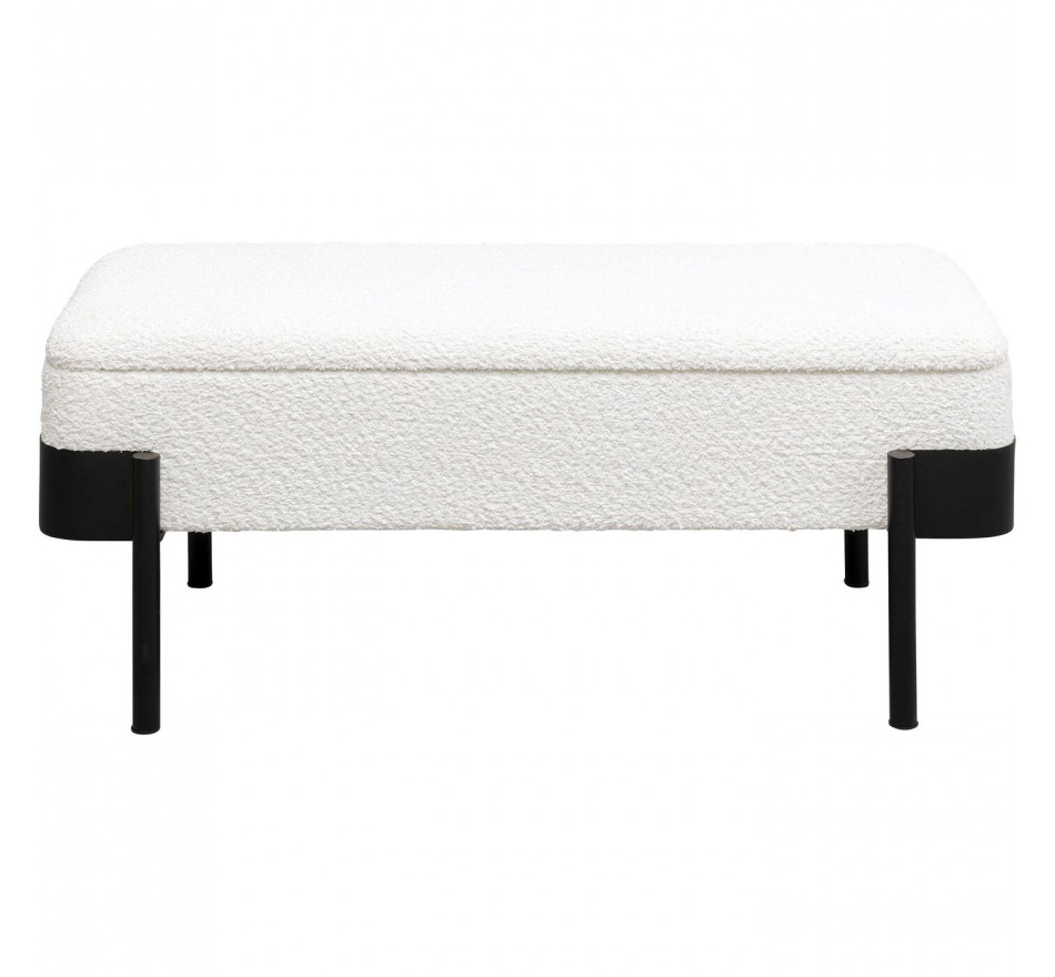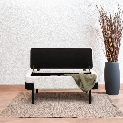 Ontdek deze elegante boxbank, een meubelstuk dat zowel praktisch als mooi is. De zwarte stalen poten ondersteunen een witte zitting van zachte stof. De echte troef van deze bank is de verborgen opbergruimte: til de zitting op om een ruim vak te onthullen, ideaal om je plaids, kussens of kinderspelletjes in op te bergen.