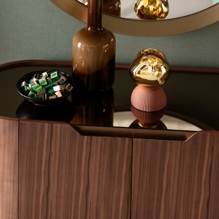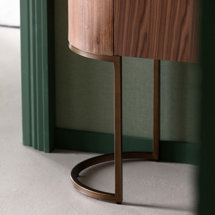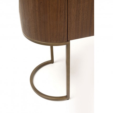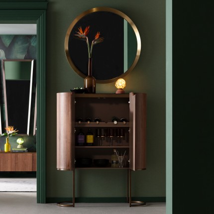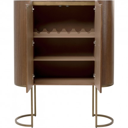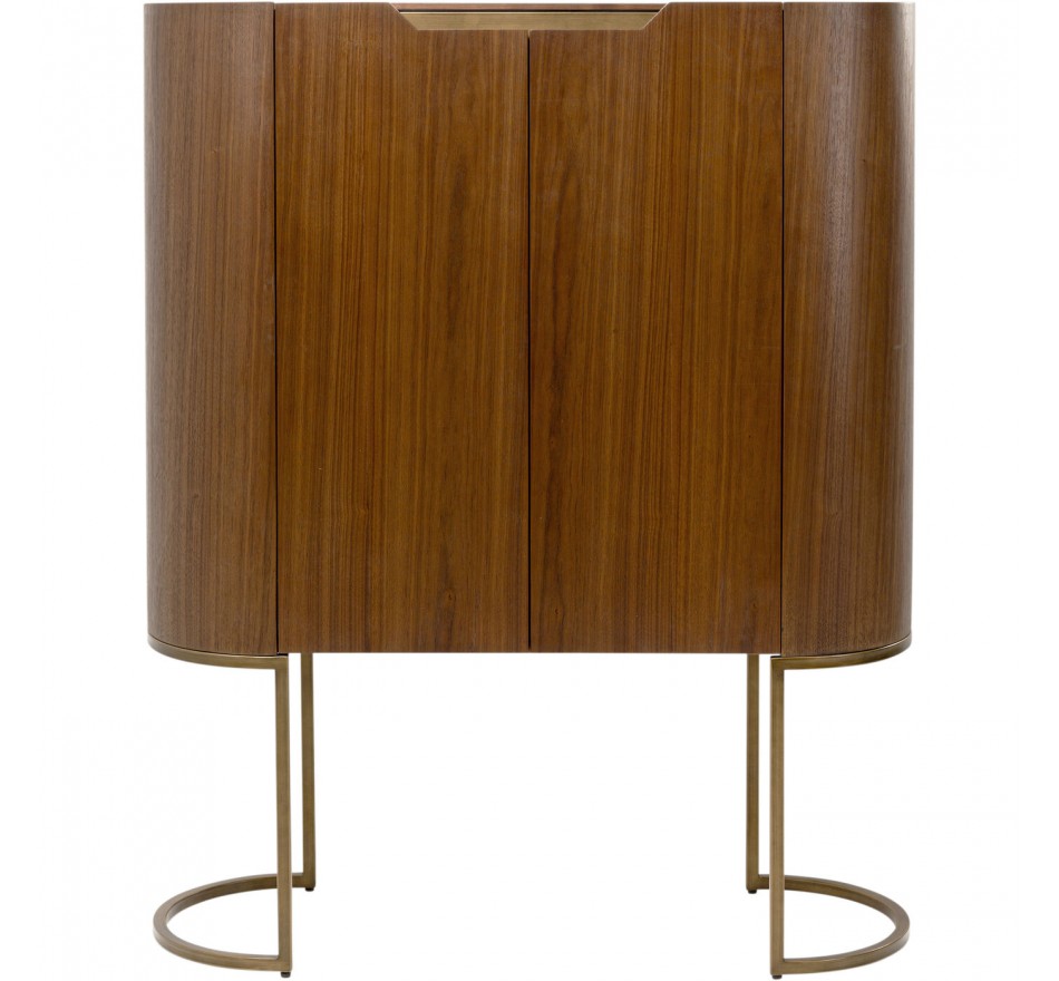 Deze bar voegt een vleugje elegantie toe aan je interieur met zijn verfijnde gebogen ontwerp. De twee deuren gaan open en onthullen twee planken en een flessenhouder, perfect om alles op te bergen wat je nodig hebt voor een heerlijk aperitief!