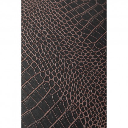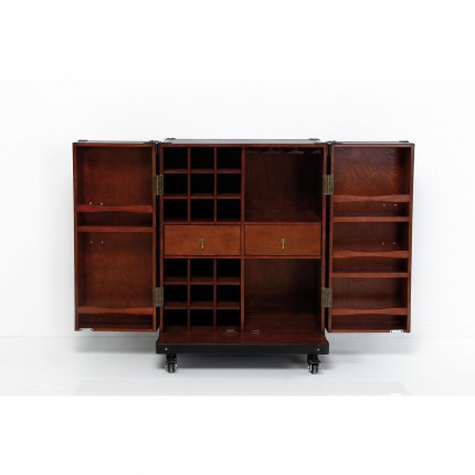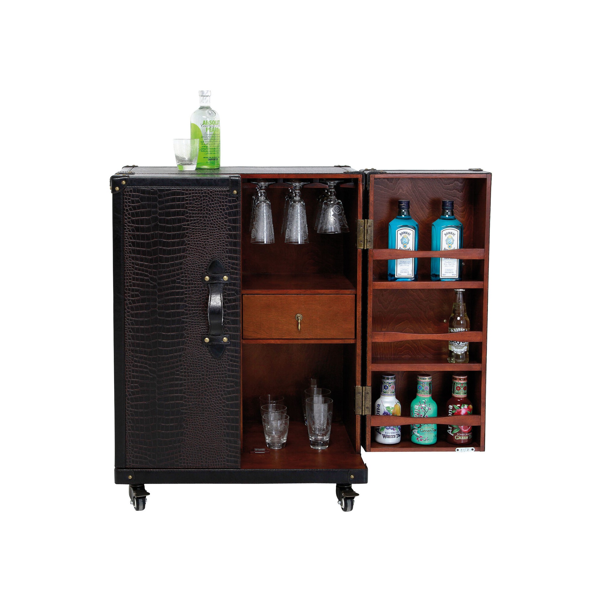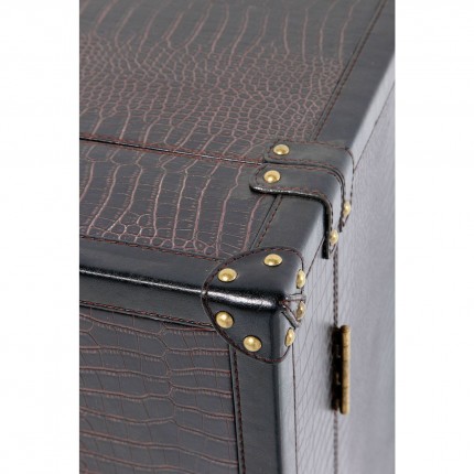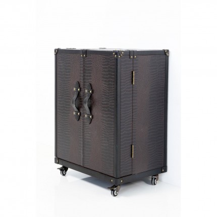 Met zijn verschillende vakken en legborden biedt deze bar een echte opbergruimte voor de toekomstige gebruiker. De kunstlederen bekleding met krokodillenprint is gedetailleerd en benadrukt de elegante koloniale stijl. De imposante handgrepen geven ook karakter aan het ontwerp. Het meubilair kan gemakkelijk worden verplaatst dankzij de 4 wielen.