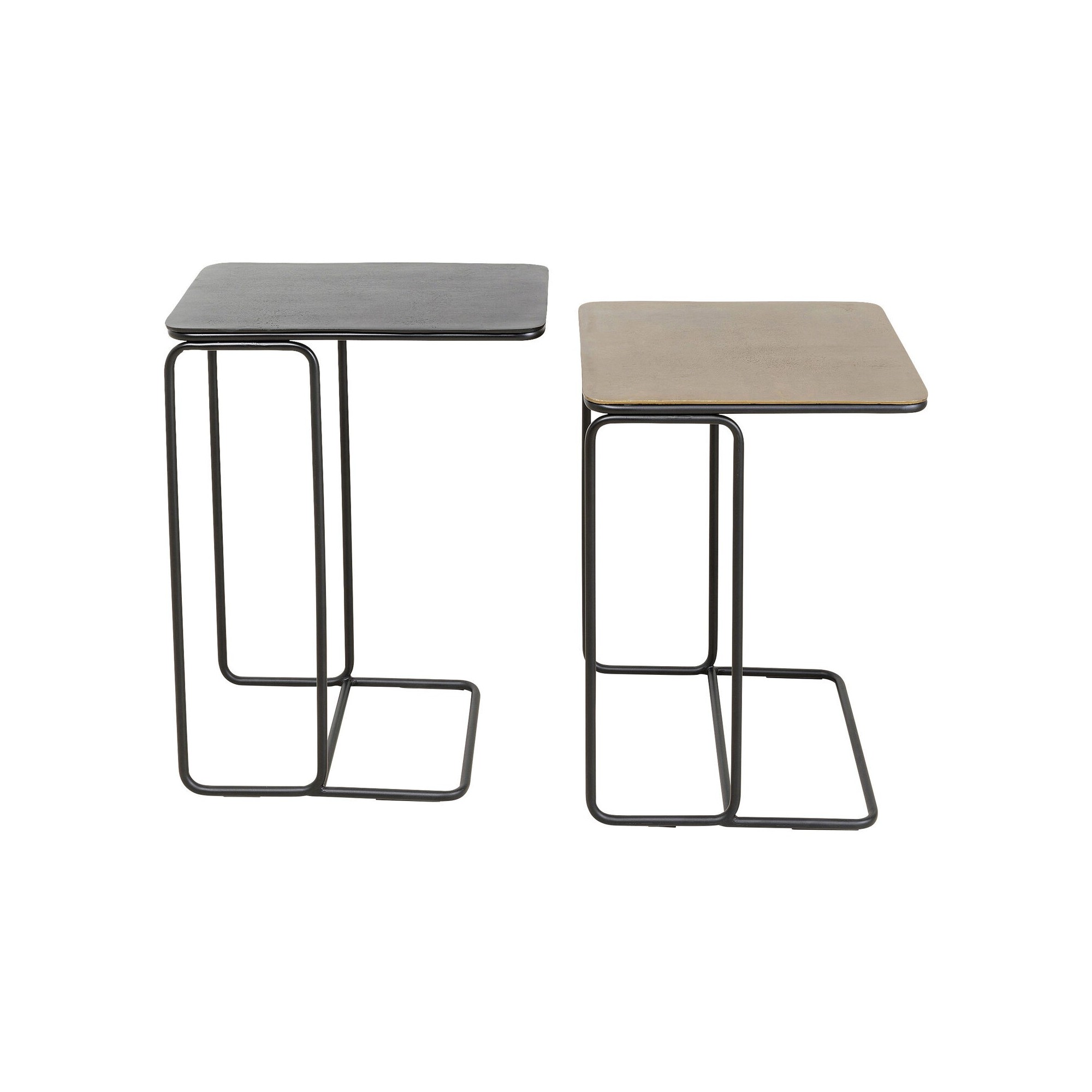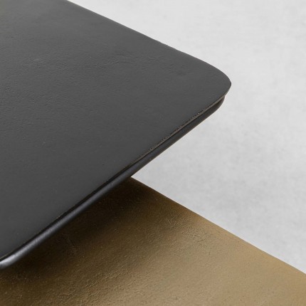 Deze set van 2 salontafels is gemaakt om lang mee te gaan, met gelakt stalen poten en zwarte en bronzen aluminium bladen. De strakke lijnen zijn elegant en gemakkelijk te combineren met je interieur.