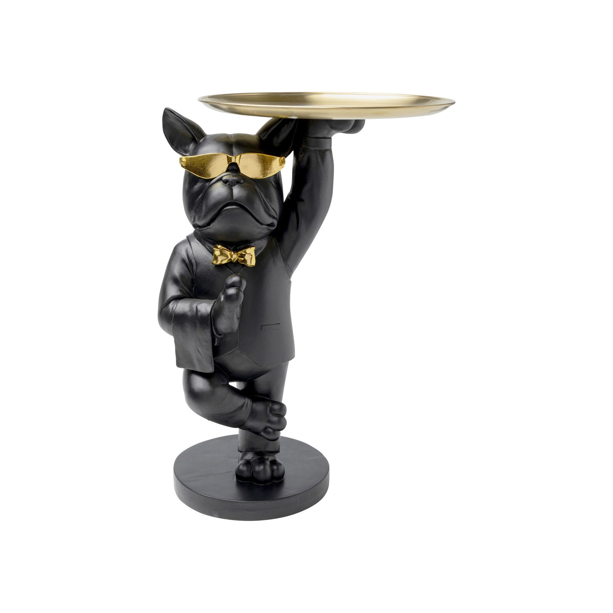 Deze bijzettafel is perfect voor hondenliefhebbers! Met de stijlvolle combinatie van zwart en goud, het strikje, de zonnebril en de ninja pose brengt deze stijlvolle butler plezier in je huis.