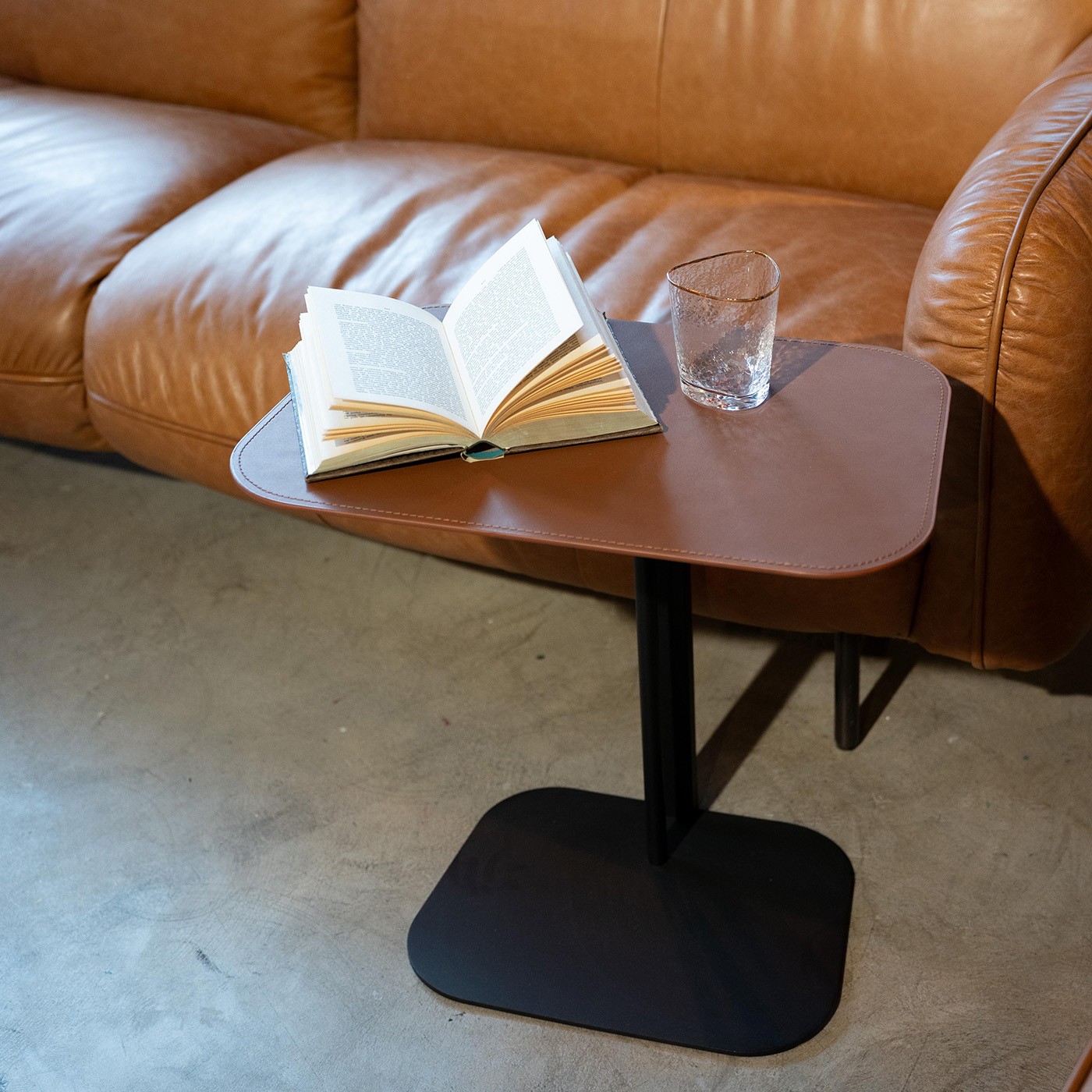 Deze bijzettafel komt echt tot zijn recht met zijn bruine kunstlederen blad en twee zwarte buizen die de poot vormen, gekoppeld aan een plat onderstel.