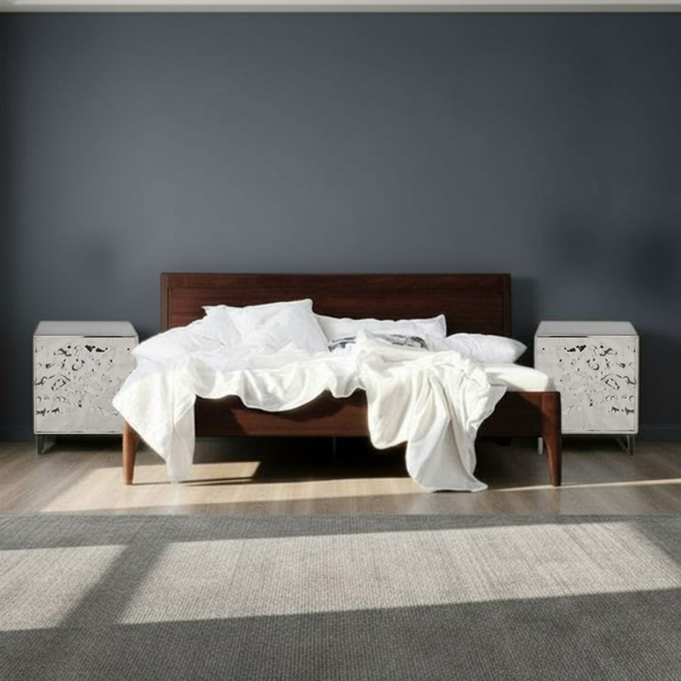 Dit moderne nachtkastje geeft elke slaapkamer een elegante, grafische touch. De gestructureerde zilveren voorkant, gecombineerd met een donkere, strakke structuur, creëert een geraffineerd contrast. Compact en functioneel, biedt het praktische opbergruimte terwijl het een sterk decoratief statement maakt naast het bed of als bijzetmeubel.