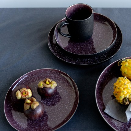 De Alissa serie bestaat uit steengoed mokken, diner- en soepborden en kommen. Het combineert karakter en elegantie met zijn zwarte buitenkant en binnenkant in diepe paarse en witte tinten, subtiel met elkaar verweven.