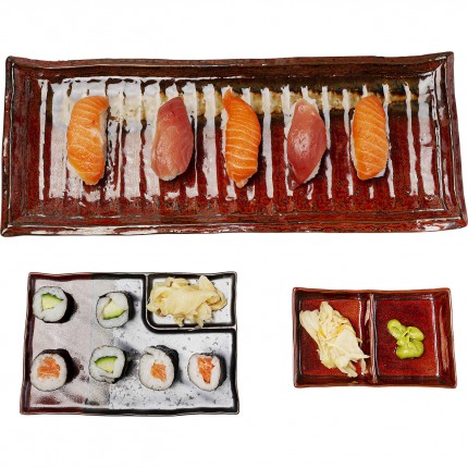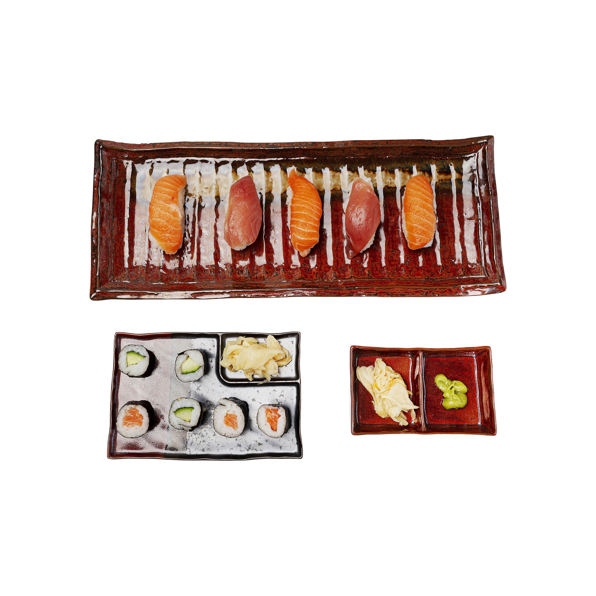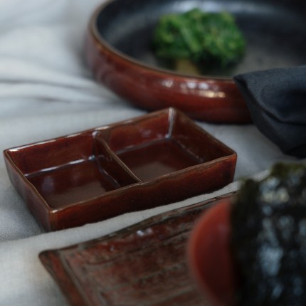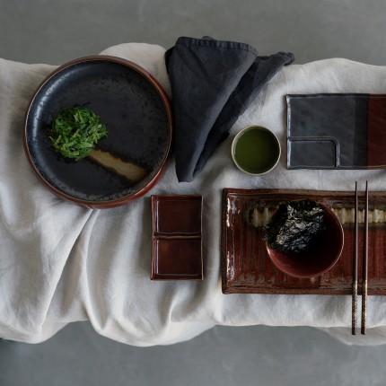 Ideaal voor liefhebbers van de Aziatische keuken en fijn servies, deze set van drie aardewerken schalen combineert op elegante wijze diepe tinten rood en grijs.