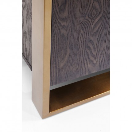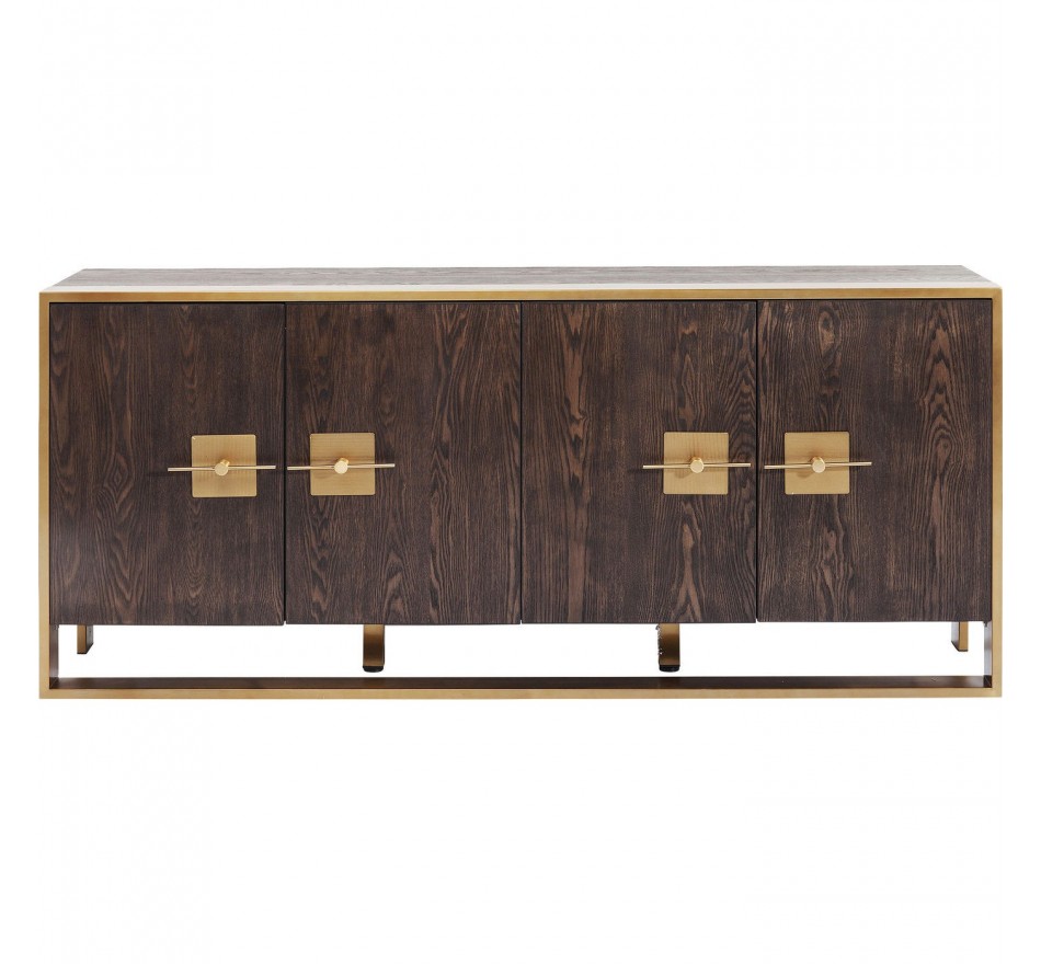 Dit dressoir heeft een retro-look met zijn gelakte asstructuur die wordt onderstreept door gouden accenten. De voorkant wordt geaccentueerd door vier brede handgrepen en een metalen frame dat de basis omvat. De Osaka collectie omvat ook een console, bureau, salontafel, eettafel, nachtkastje en plank.