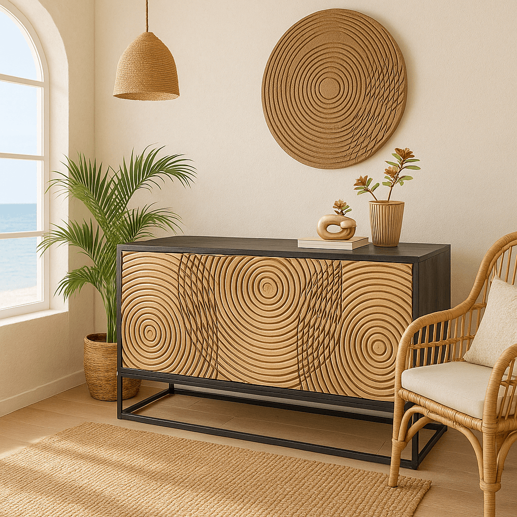 Dit dressoir met een eigentijds ontwerp combineert een acaciastructuur met een mangoboomfront, beide gelakt, gemonteerd op een stalen sokkel. De drie deuren, die met een vingerafdruk opengaan, zijn versierd met cirkels in reliëf.