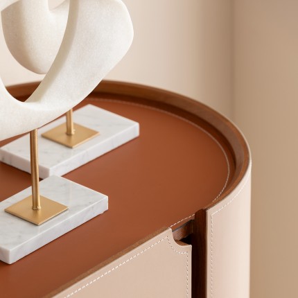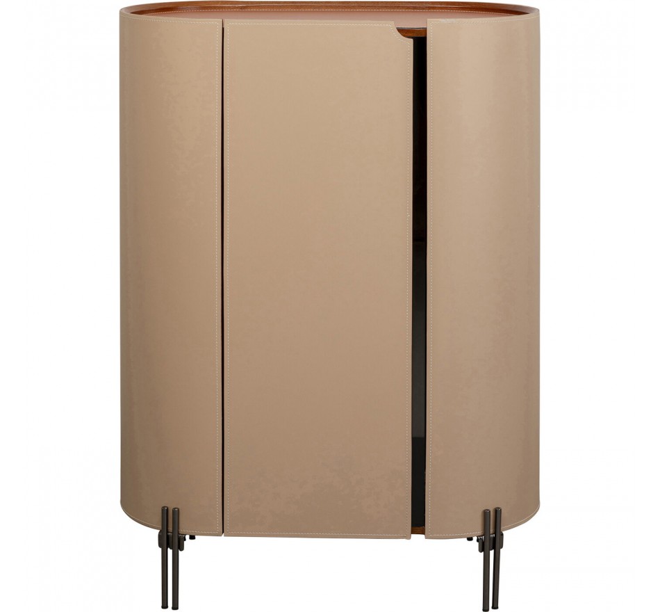 Dit eigentijdse hoge dressoir in bruintinten biedt een strak ontwerp in kunstleer met zichtbare naden. Met een compartiment met drie planken is het perfect voor het organiseren van je spullen en voegt het een stijlvol tintje toe aan je huis.