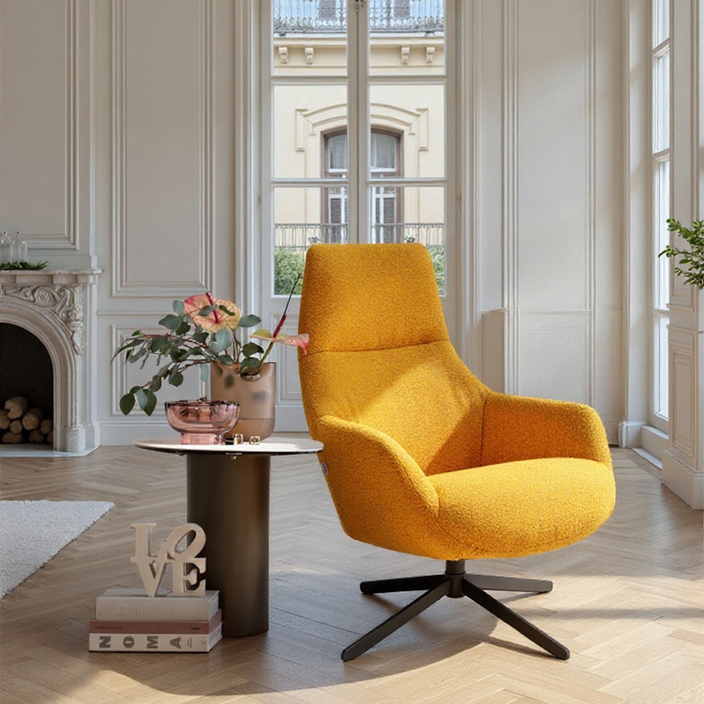 Zink weg in comfort met deze draaifauteuil met uitnodigende armleuningen en stof met lussen, ideaal om een gezellig tintje aan je interieur te geven.
