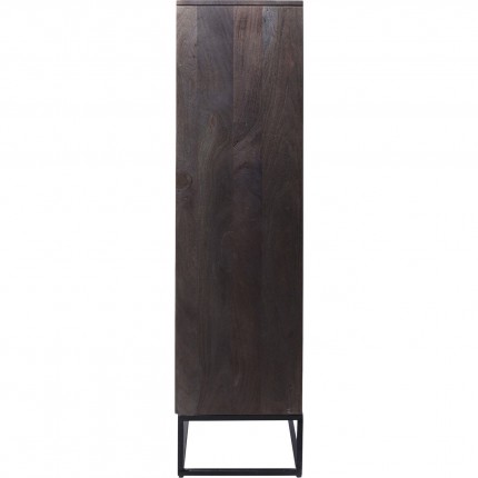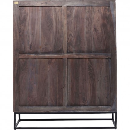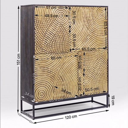 Deze eigentijdse kast combineert een acaciastructuur met een mangohouten voorkant, beide gelakt en gemonteerd op een stalen onderstel. De vier deuren, die met één vinger opengaan, zijn versierd met verhoogde cirkels.