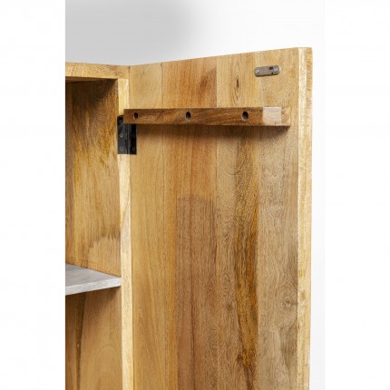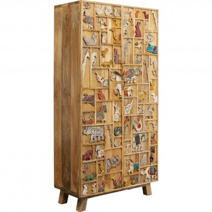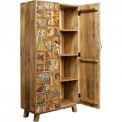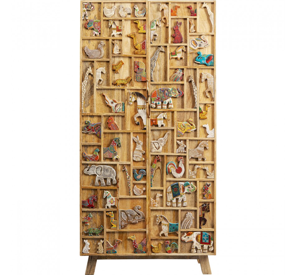 Deze houten kledingkast zal kinderen zeker bekoren, met dieren die in de voorkant zijn uitgesneden. Paarden, olifanten, giraffen, konijnen en dromedarissen voegen een kleurrijke, vrolijke sfeer toe aan de slaapkamer.