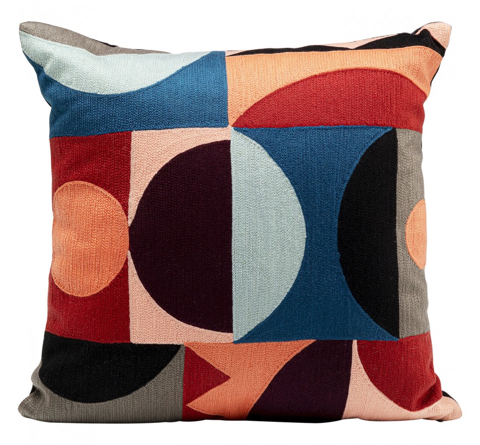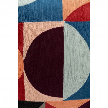 Een gedurfde lappendeken van kleuren en geometrische vormen verstrengelt op dit kussen van geweven stof. Een spel van texturen en contrasten dat niet onopgemerkt zal blijven, perfect voor een inrichting die origineel durft te zijn!