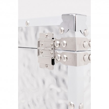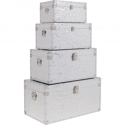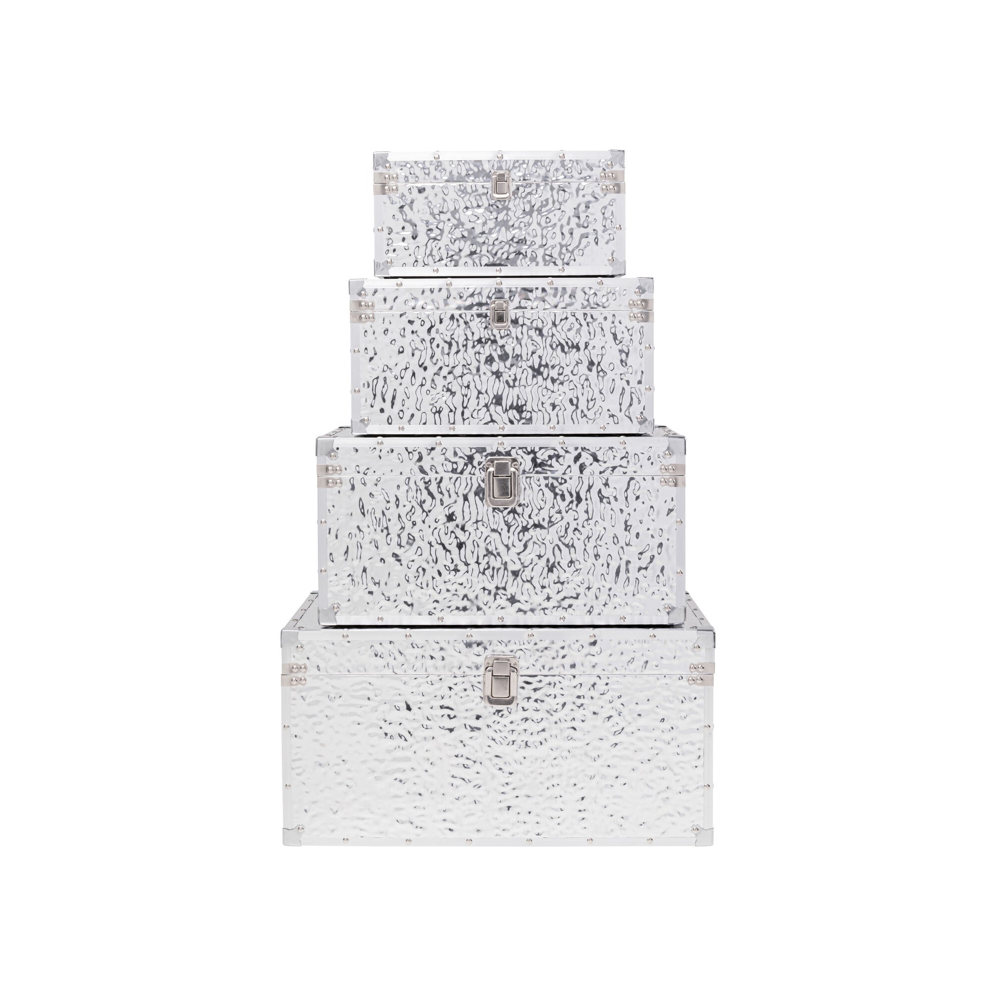Deze set van 4 commodes in verschillende maten maakt indruk door de zilverkleurige stalen bekleding met een structuureffect, die een eigentijds tintje aan je opbergruimte geeft.